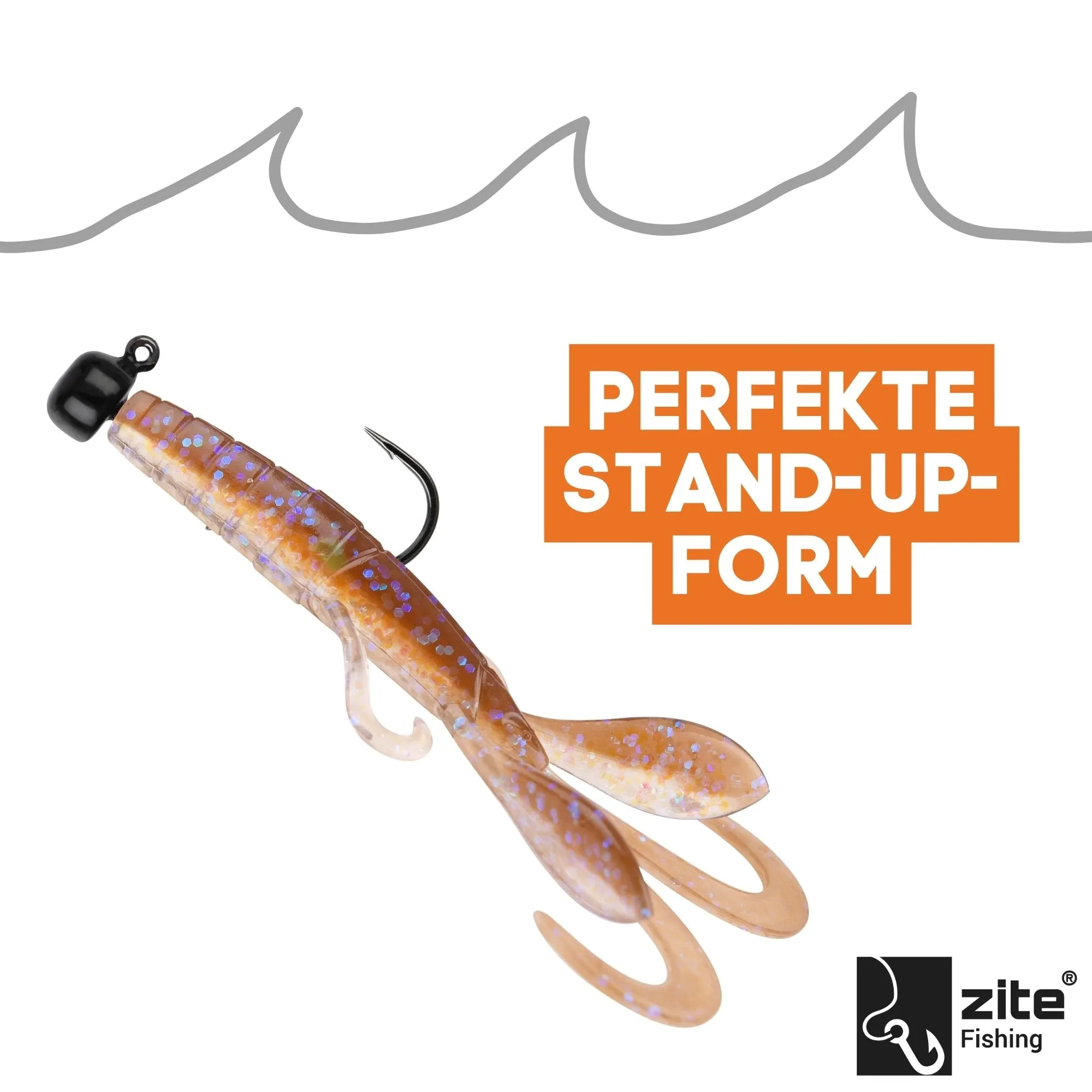 Im Bundle enthalten sind Stand Up Jigs in Hakengröße #1/0 mit 7 g (5 Stück im Pack) sowie ein Tungsten Stand-Up Jig in Hakengröße #1 mit 3,5 g. Das Stand-Up-Prinzip sorgt dafür, dass sich der Köder am Boden stabiler ausrichtet, während der Haken nach oben zeigt. Dadurch lässt sich strukturreiches Terrain kontrolliert abtasten und die Präsentation wirkt ruhiger, was besonders bei vorsichtigen Bissen Vorteile bringt. Die Tungsten-Variante ergänzt das Setup mit kompakter Bauform und sehr direkter Rückmeldung bei Bodenkontakt.