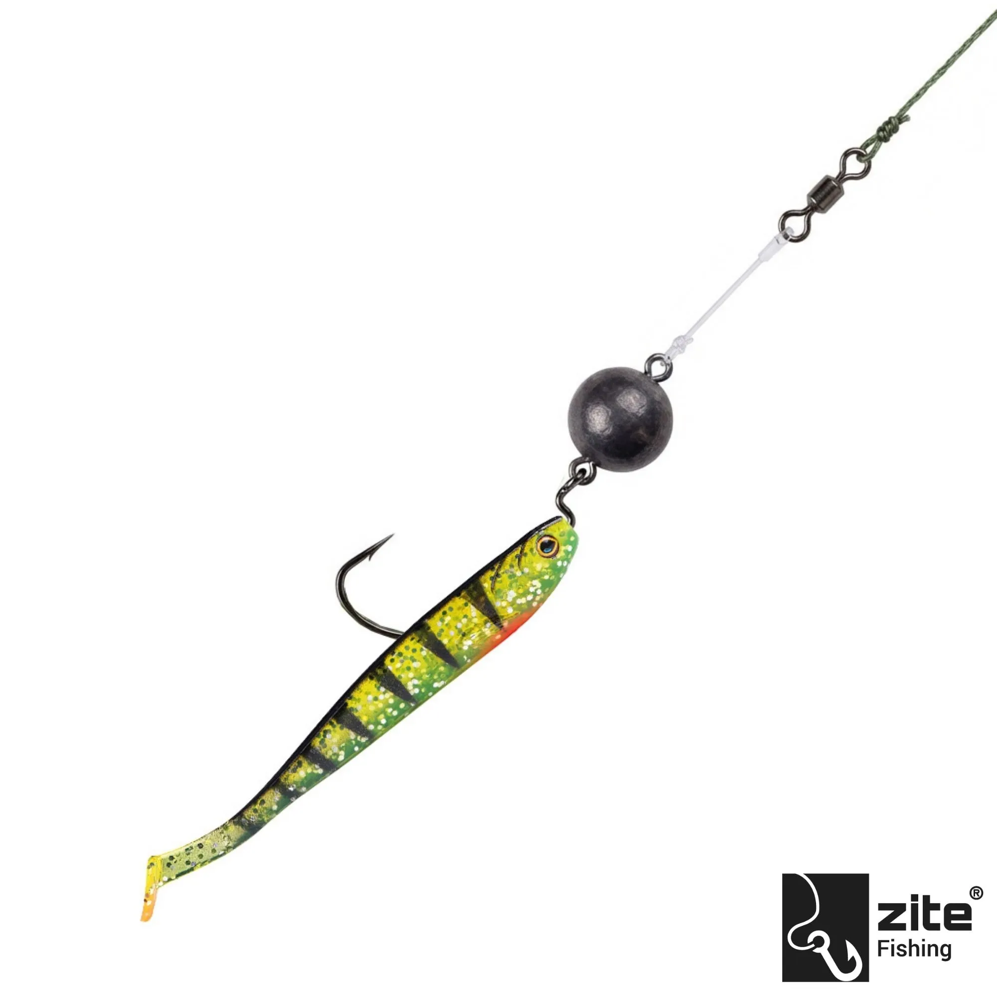 Was das Cheburashka Rig ausmacht: Das Gewicht besitzt eine herausnehmbare Öse. Für die Montage wird die Öse aus dem Gewicht gezogen, der gewünschte Haken eingefädelt und die Öse wieder eingesetzt. Durch diese freie Verbindung kann der Köder beim Einholen und in den Absinkphasen natürlicher arbeiten. Gleichzeitig bleibt die Hakenwahl variabel – je nach Köderform, Gewässerstruktur oder gewünschter Präsentation.