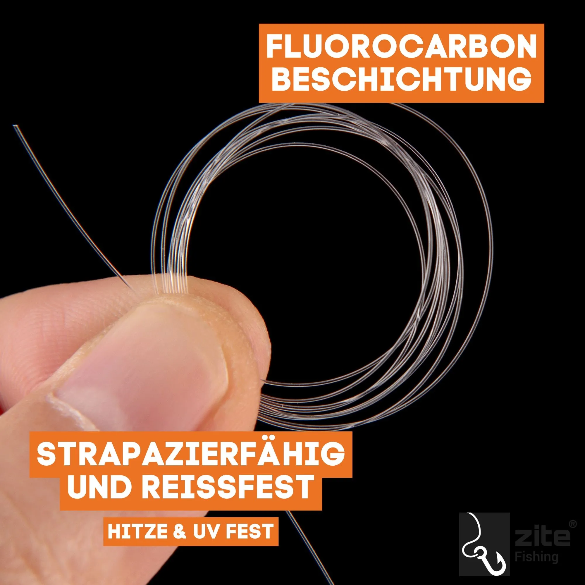 Abgerundet wird das Setup durch zwei fluorocarbon-beschichtete Vorfachschnüre auf je 30 m Spule: 0,28 mm mit 5 kg Tragkraft sowie 0,35 mm mit 8 kg Tragkraft. Der monofile Kern unterstützt eine zuverlässige Knotbarkeit, während die Fluorocarbon-Ummantelung für eine dezente Präsentation ausgelegt ist – passend für häufige Rigwechsel und unterschiedliche Zielfischsituationen.