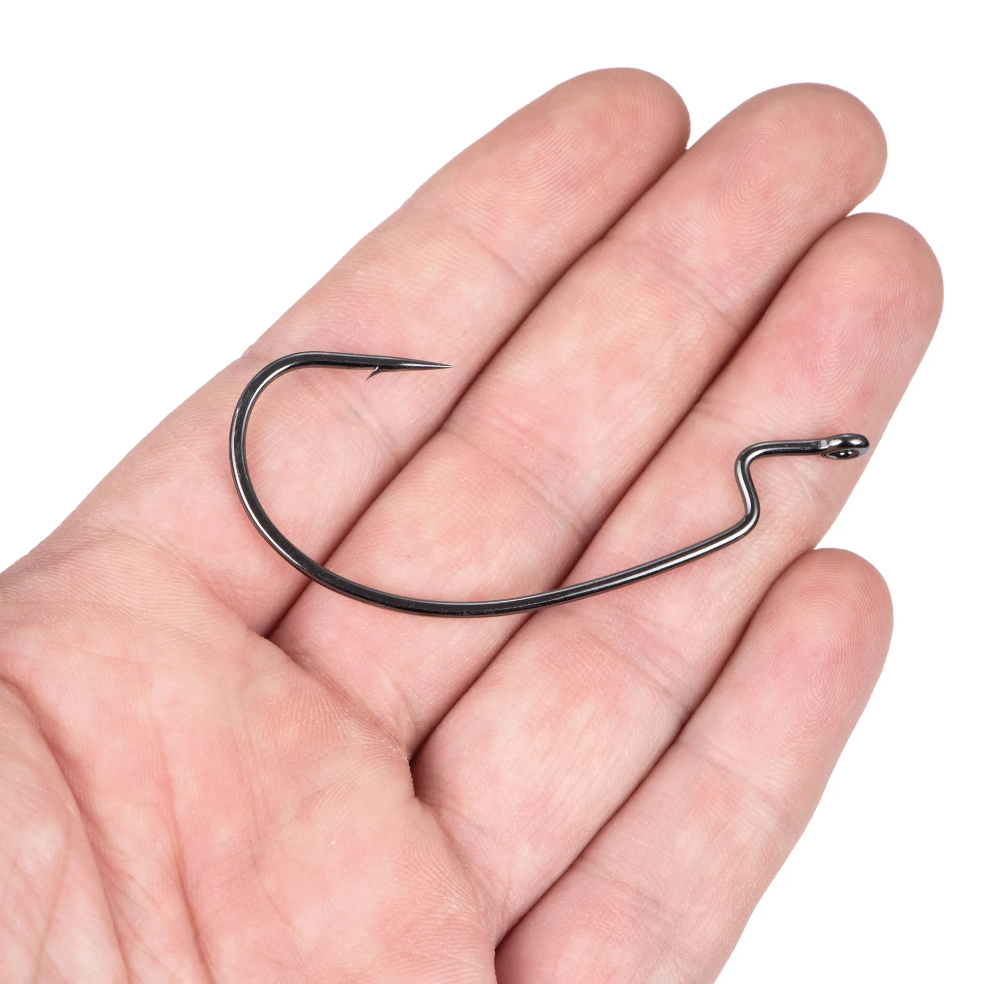 Für die passende Hakenabstimmung liegen zwei Offset-Haken-Tütchen bei: Größe 1 (5 Stück) und Größe 2/0 (5 Stück). Gefertigt aus High Carbon Steel, scharf und mit Widerhaken ausgestattet, eignen sie sich für klassische Cheburashka-Montagen mit Softbaits sowie für weitere Rig-Anwendungen wie Drop Shot.