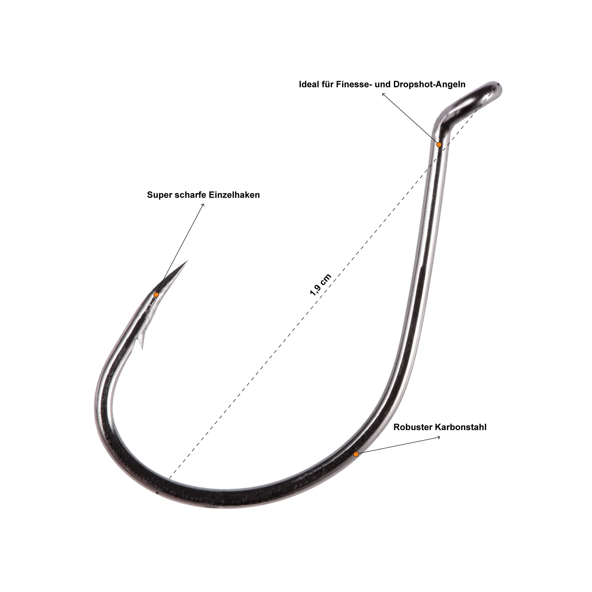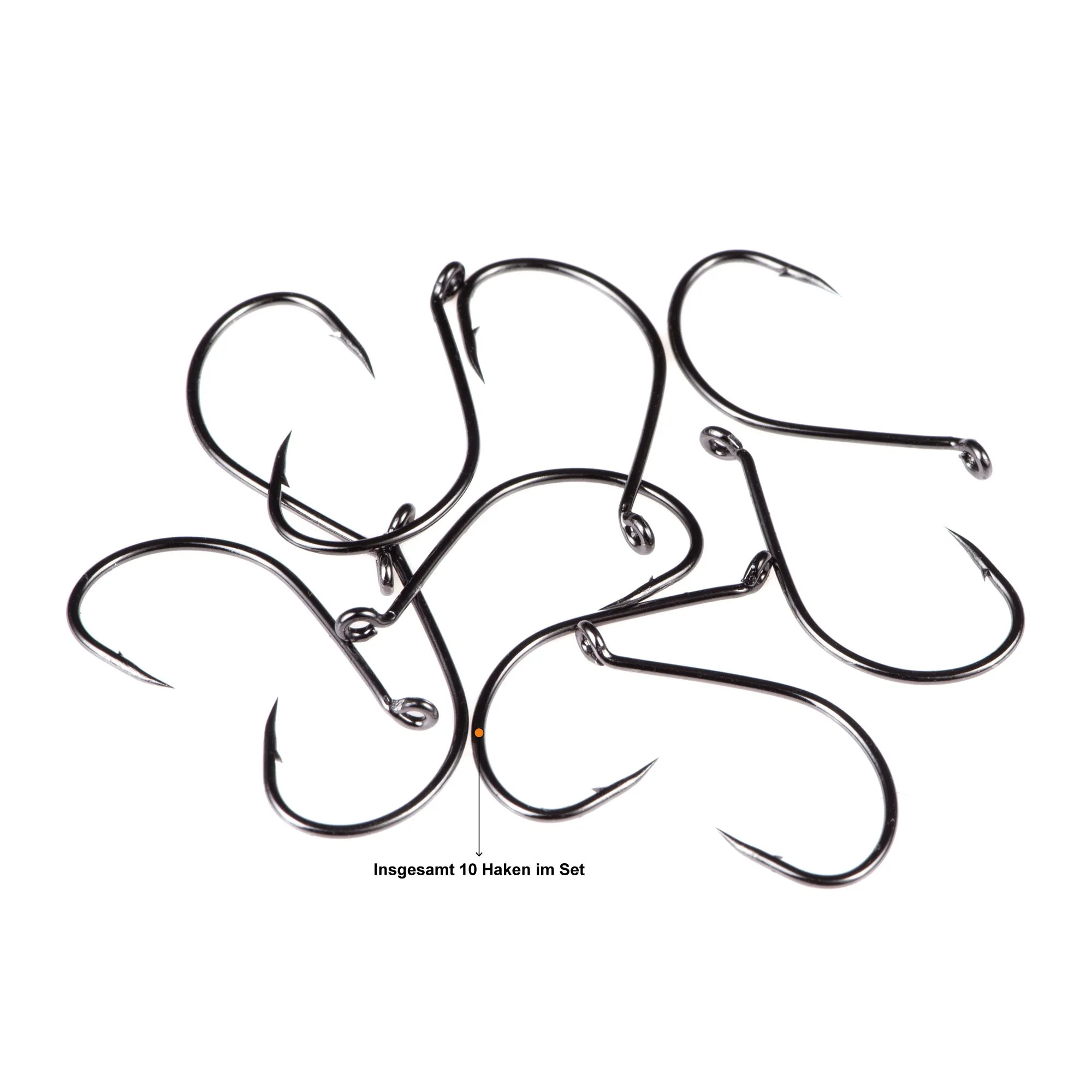 Für die Hakenseite sind zwei Dropshot-Haken-Sets enthalten: Größe S und Größe L, jeweils 10 Stück. Die Haken bestehen aus robustem Karbonstahl, sind scharf ausgeführt und eignen sich für verschiedene Drop-Shot-Varianten, inklusive Nose Hook. Je nach Zielfisch und Ködergröße lässt sich so passend abstimmen – von feinen Präsentationen bis zur stärkeren Ausrichtung auf Zander.