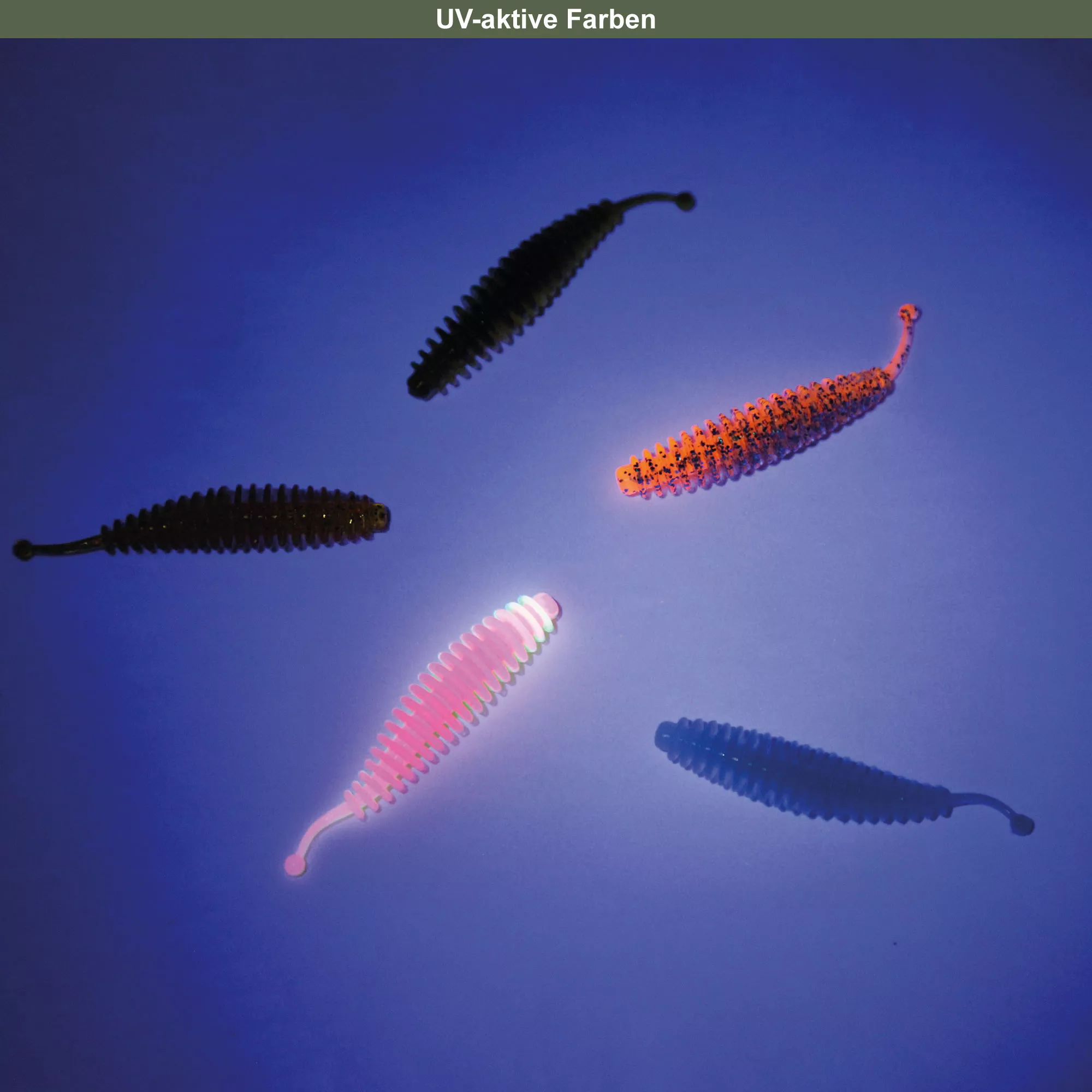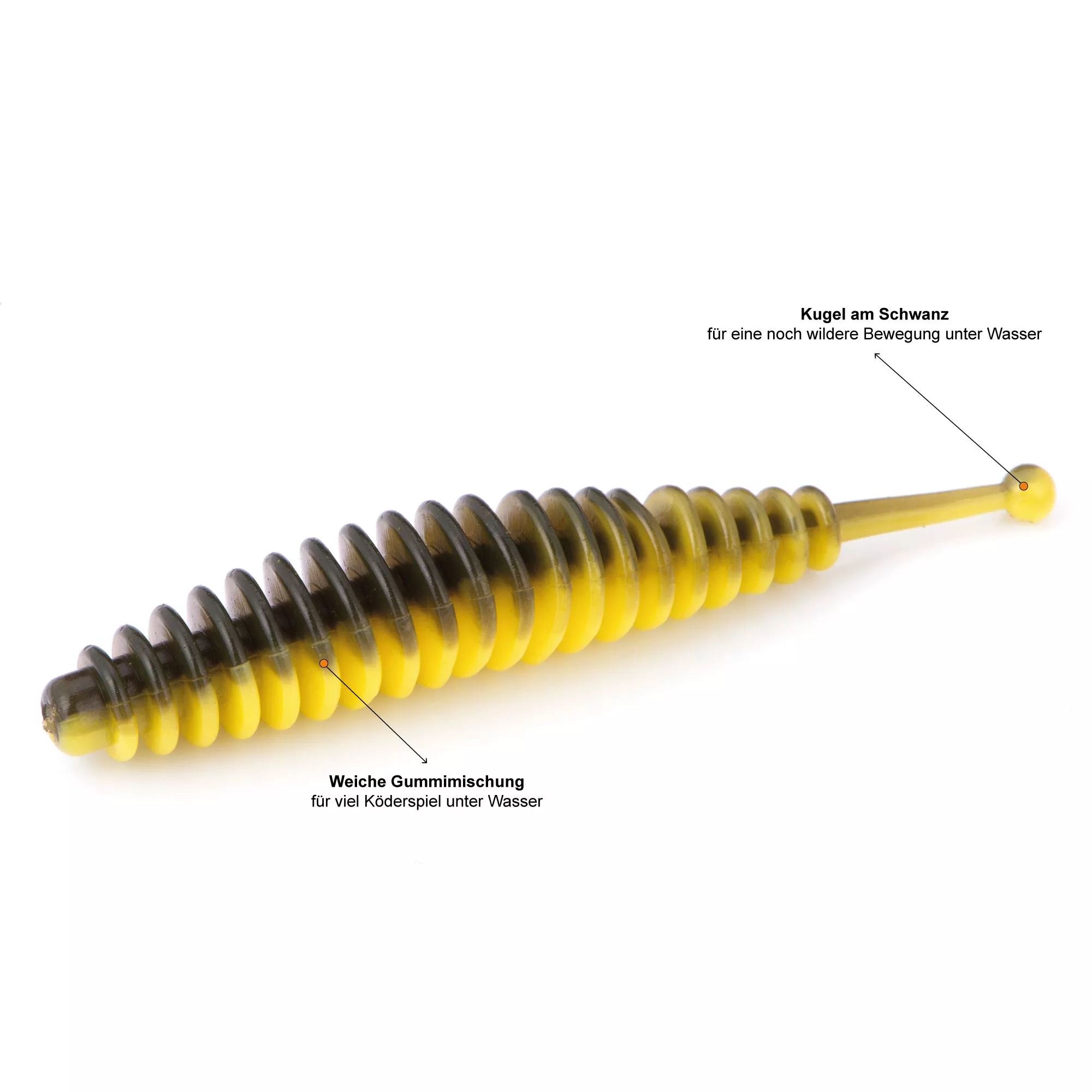 Die spezielle Form der Gummiwürmer und die Kugel am Schwanz sorgen für eine wilde Bewegung unter Wasser. Zudem ermöglicht die weiche Gummimischung viel Körperspiel unter Wasser.