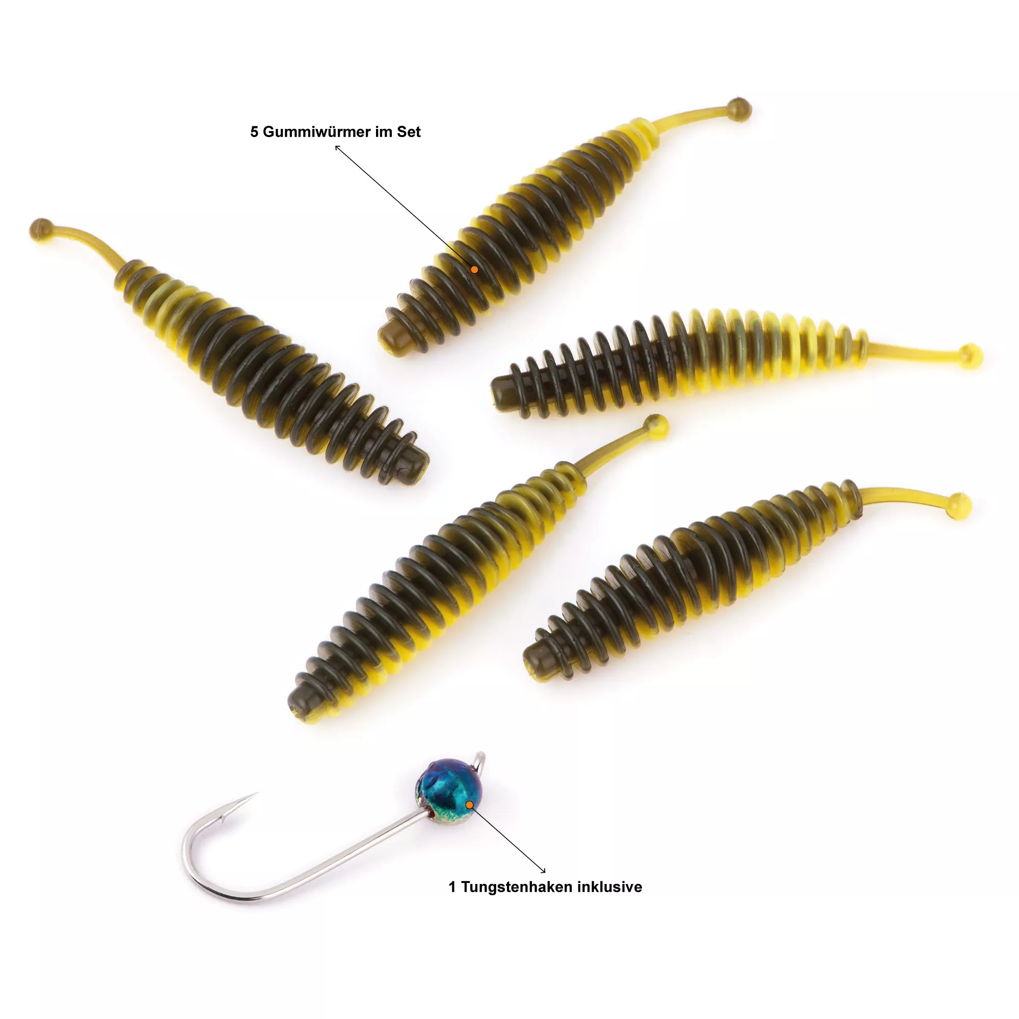 Im Set ist jeweils ein Metallic Rainbow Tungstenhaken und 5 Gummiwürmer enthalten. Die beliebten Feinrippwürmer werden beim UItra Light Angeln mit einer Spinnrute eingesetzt