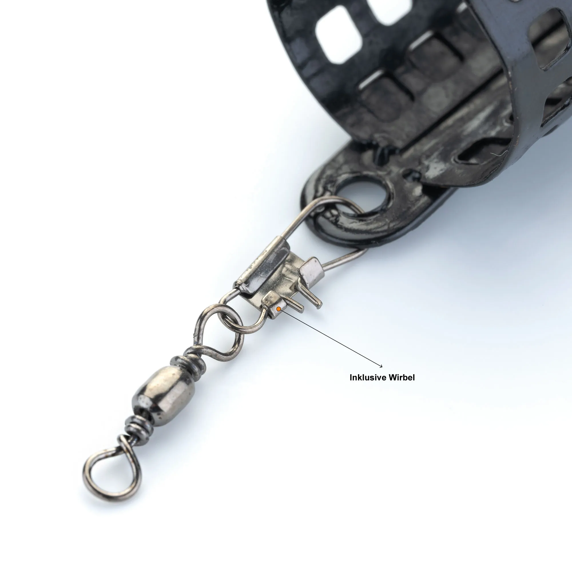 Für ein einfaches Handling wurden die Futter-Körbe jeweils direkt mit einem Angelwirbel versehen. Dank seiner Form und dem Gewicht lässt sich der Futtermix beim Feedern ideal auch auf große Distanzen platzieren.