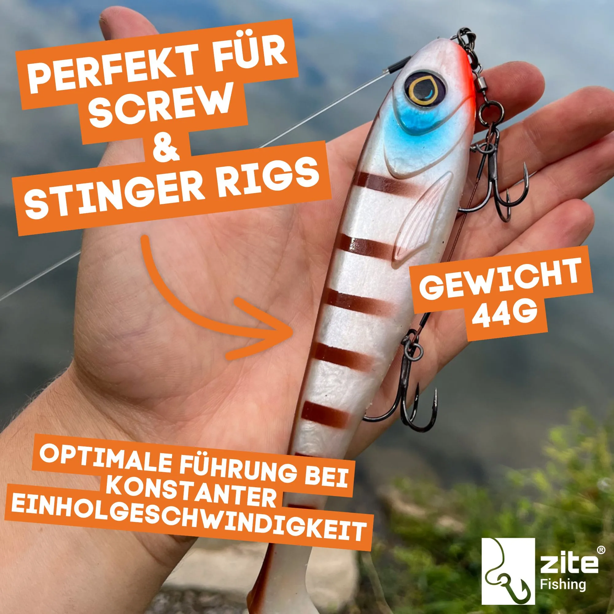 Dank seiner großen Schwanzschaufel erzeugt dieser Köder eine verführerische Taumelbewegung, die insbesondere bei gleichmäßiger Einholbewegung große Hechte anzieht.