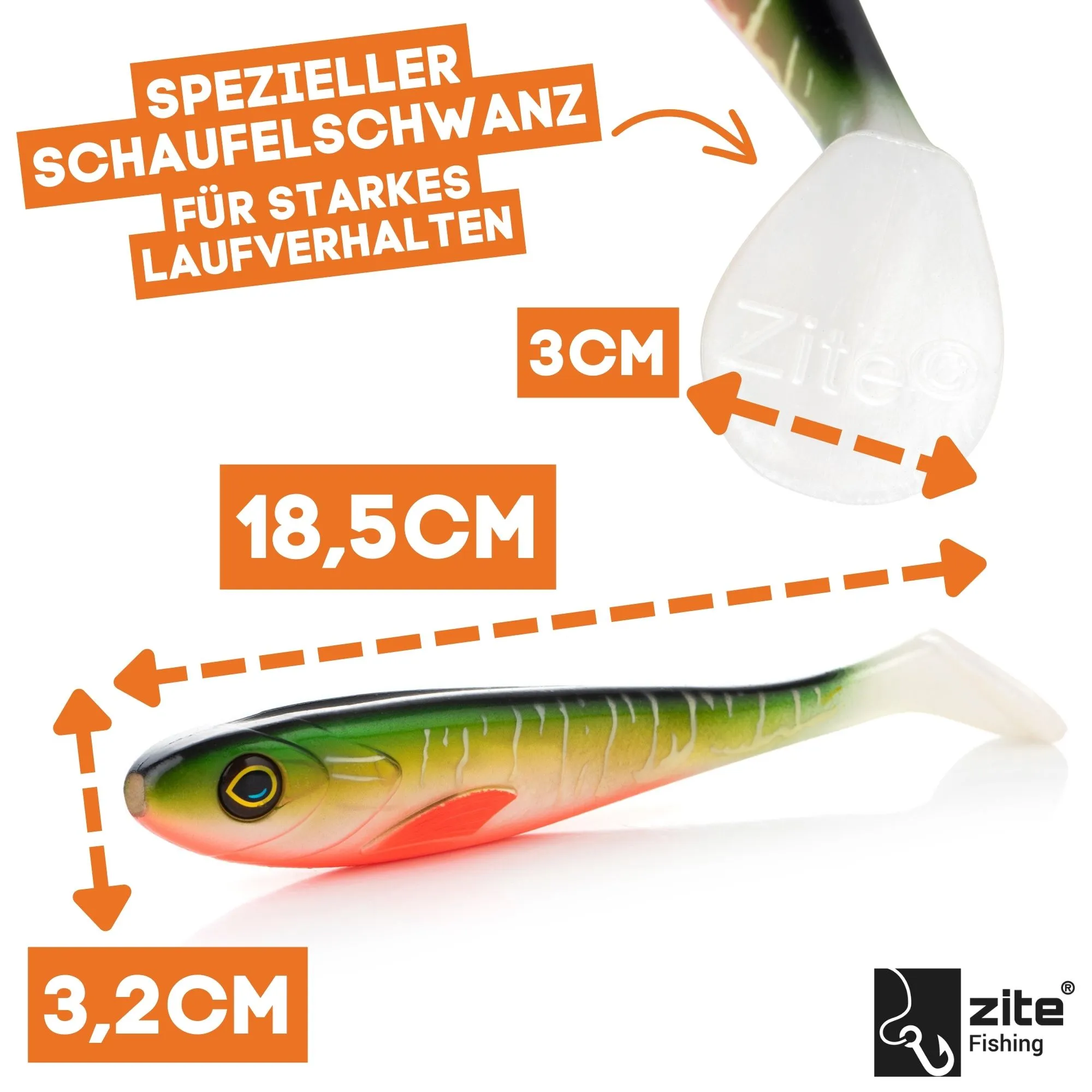 Dieser 18,5 cm lange Gummiköder mit einer robusten Gummimischung wurde gezielt entwickelt, um große Raubfische wie Hechte anzulocken und ist daher die perfekte Ausrüstung für das Hechtangeln.