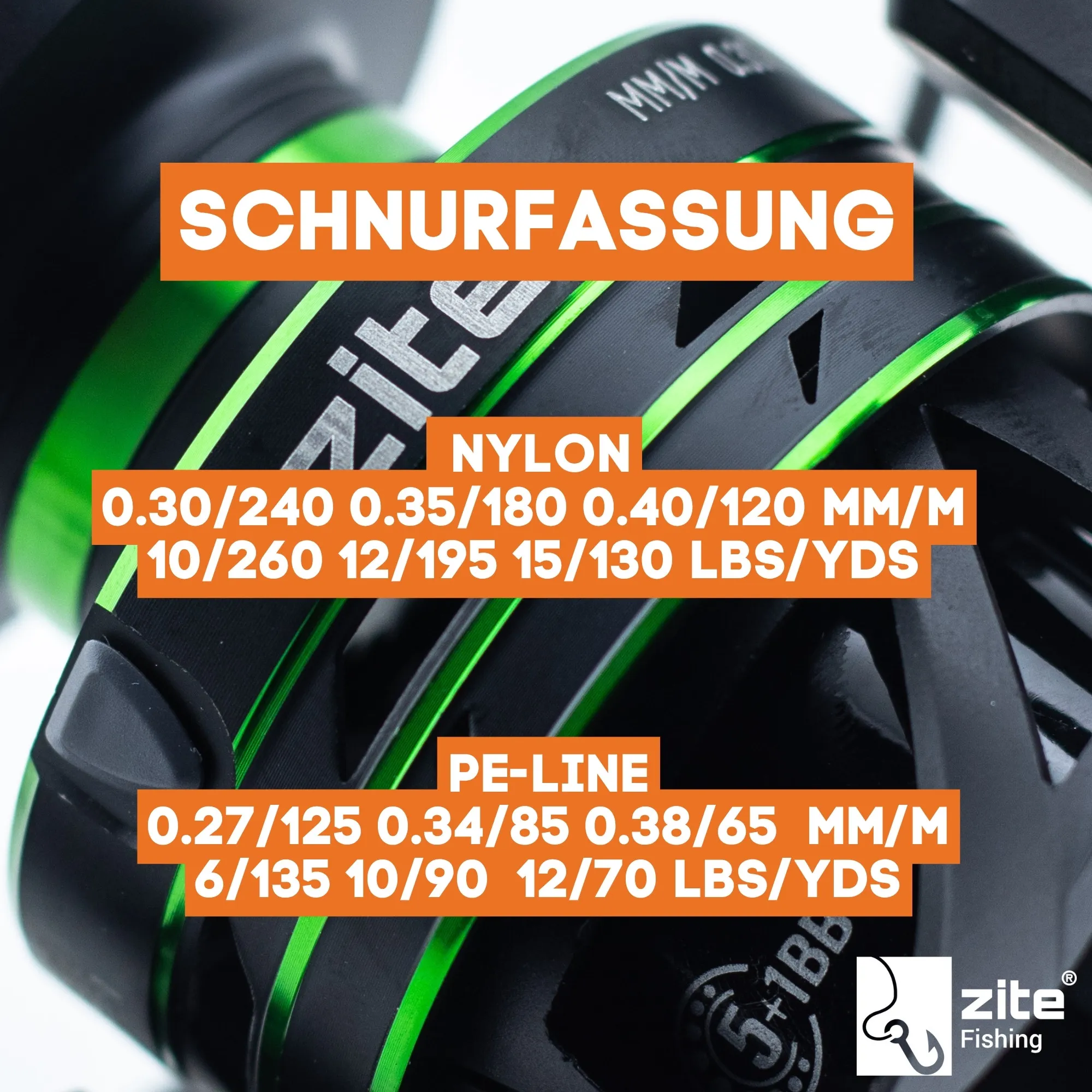 Die dazu passende Spinning Reel Base 4000 ist ein zuverlässiger Partner beim Drill starker Räuber. Mit 5+1 Kugellagern, einer fein justierbaren Frontbremse mit bis zu 7 kg Bremskraft, einer 5,2:1 Übersetzung und einem Schnureinzug von rund 85 cm pro Kurbelumdrehung bietet sie Power und Kontrolle in jeder Situation. Trotz ihrer Robustheit bleibt sie mit etwa 280 g angenehm leicht, während die CNC-Aluminiumkurbel mit EVA-Knauf für hohen Bedienkomfort sorgt. Zwei Aluminiumspulen runden die Ausstattung ab.