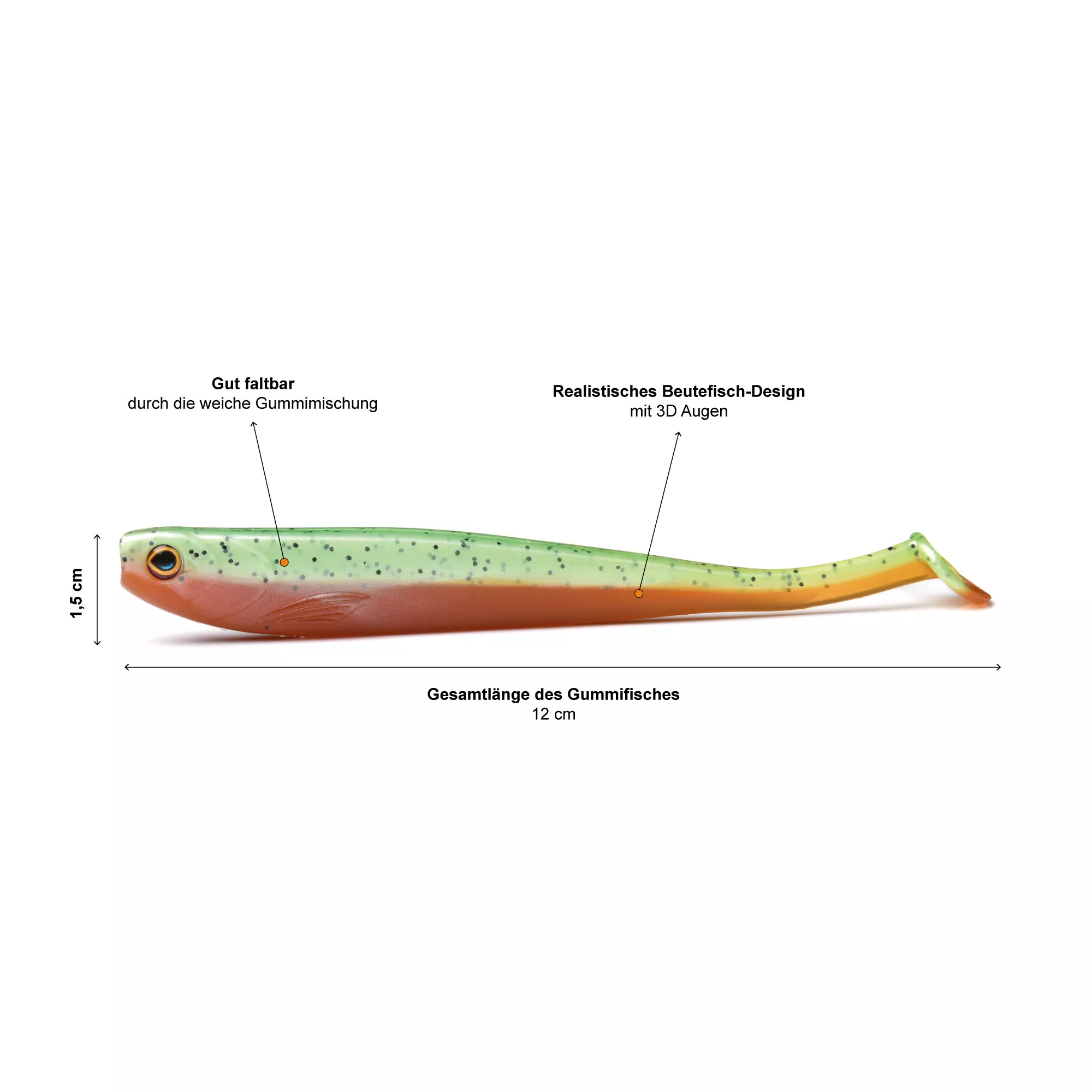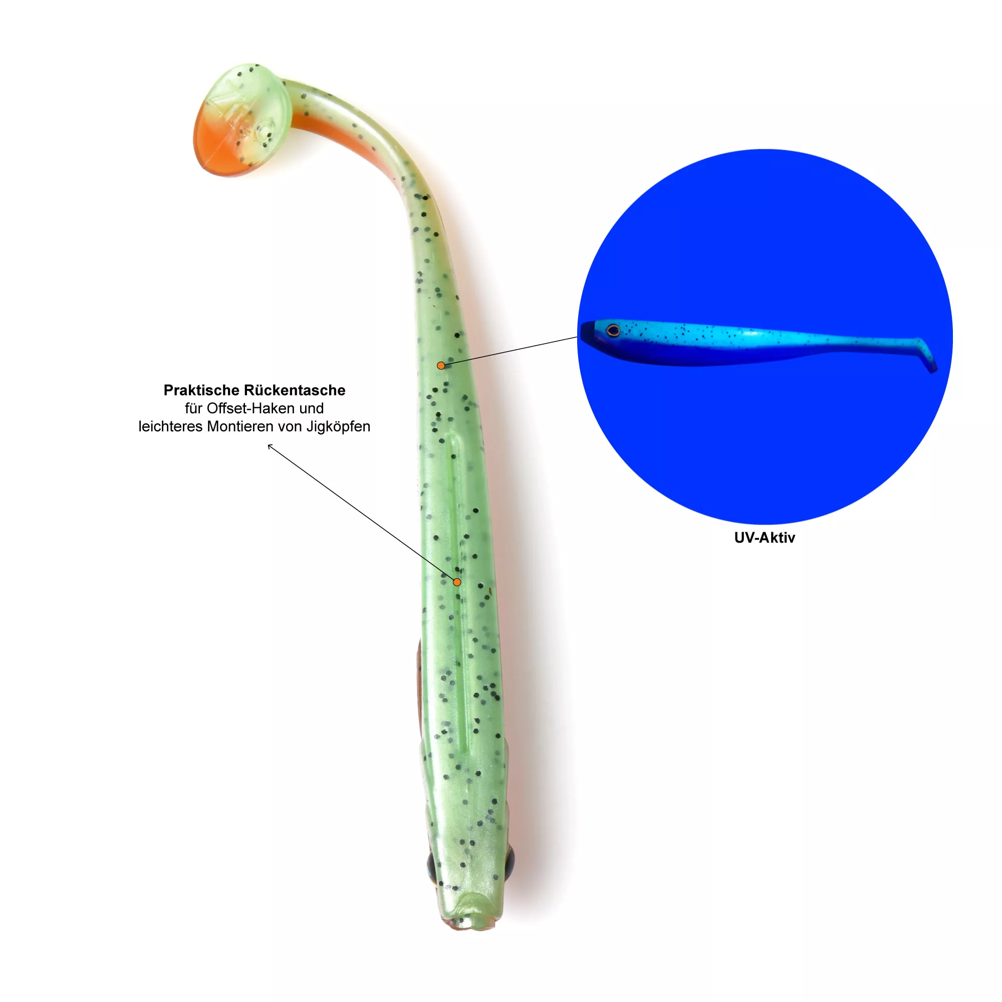 Um die Fängigkeit der Köder und Farbvarianten noch um ein weiteres Stück zu steigern, wurden die Farben größtenteils UV-aktiv gehalten. Dies bringt gerade bei trüberem Wasser und bedeckterem Wetter nochmal einen zusätzlichen Joker ins Spiel.