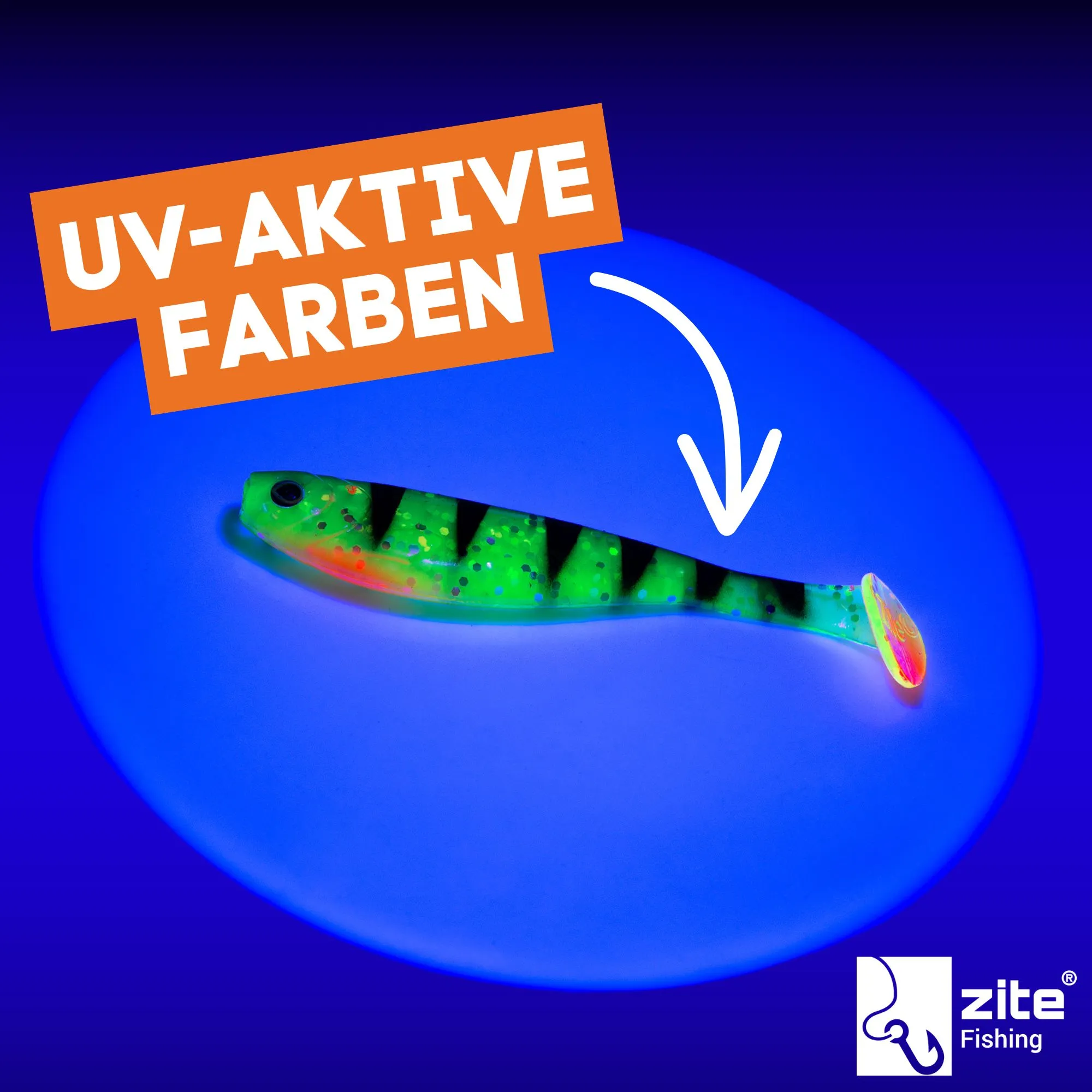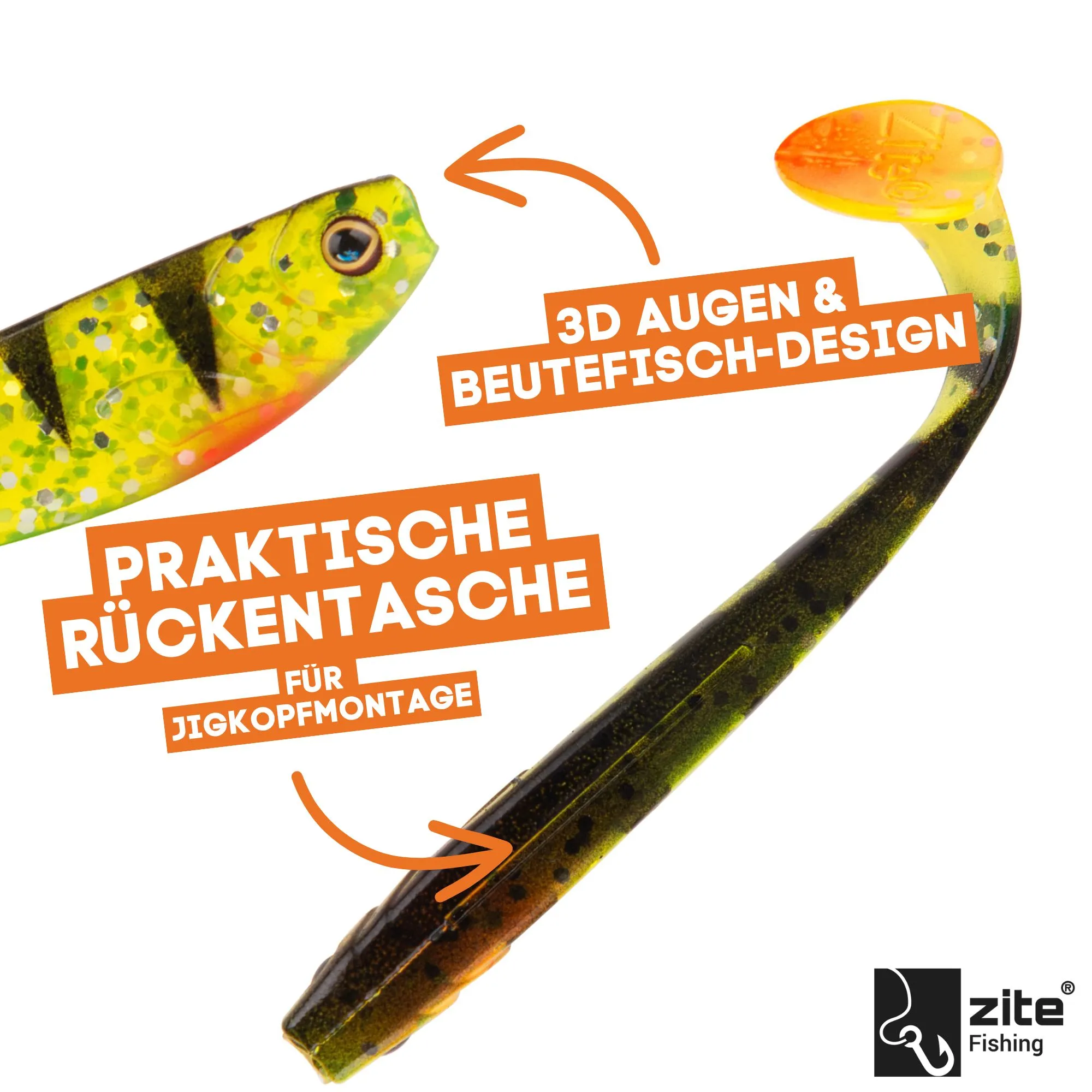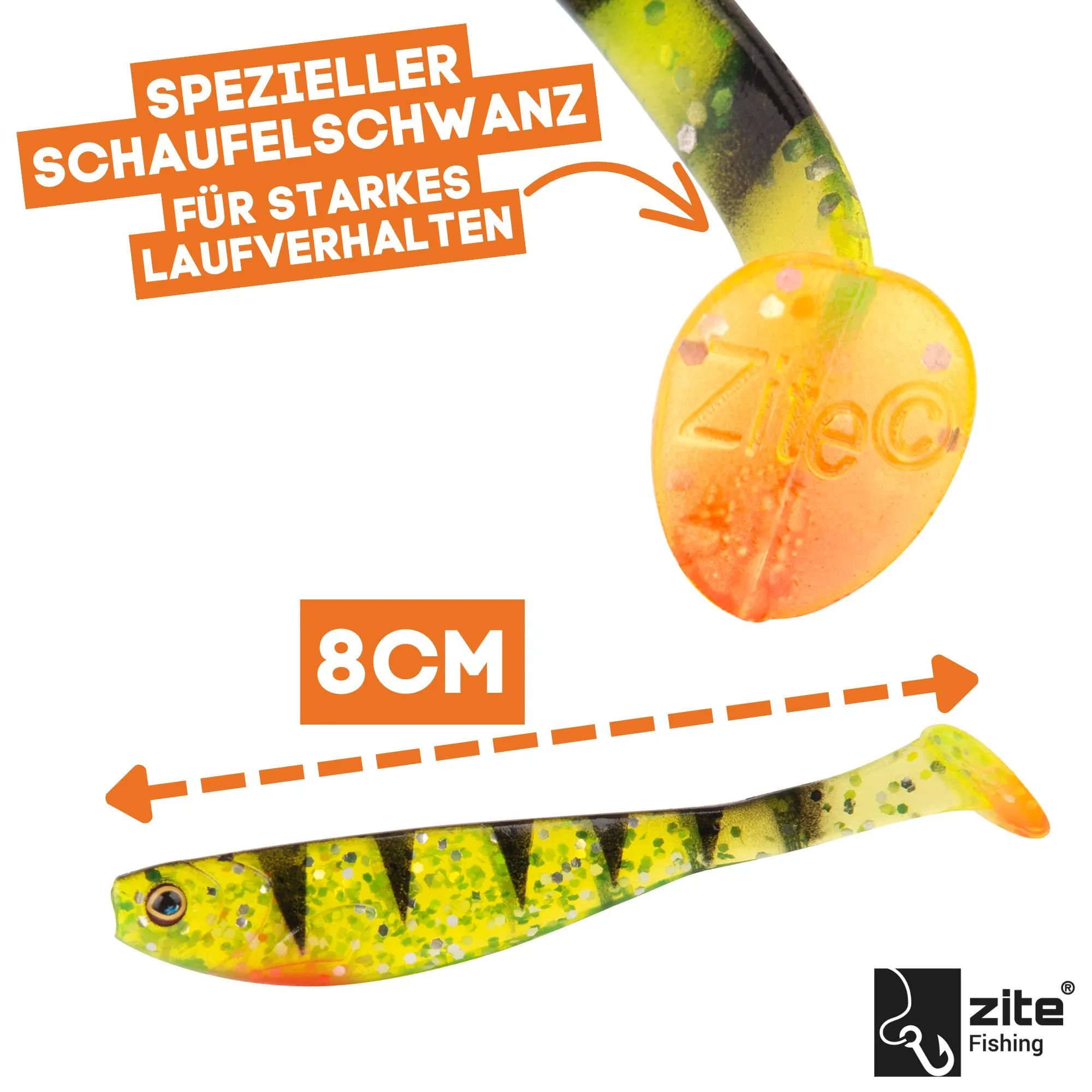 Für die Montage sind 5 Jighaken (Größe 3/0, 15 g, Mustad-Haken) enthalten, die durch ihre Schärfe und Stabilität überzeugen. Abgerundet wird das Set durch eine Packung Inzite Pershad Gummifische in 8 cm Länge (Lightning Perch, 7 Stück). Mit ihrer bauchigen Form, dem lebhaften Schwanzteller und der UV-aktiven Farbgebung zählen sie zu den fängigsten Ködern auf Barsch und haben sich bereits vielfach in der Praxis bewährt.