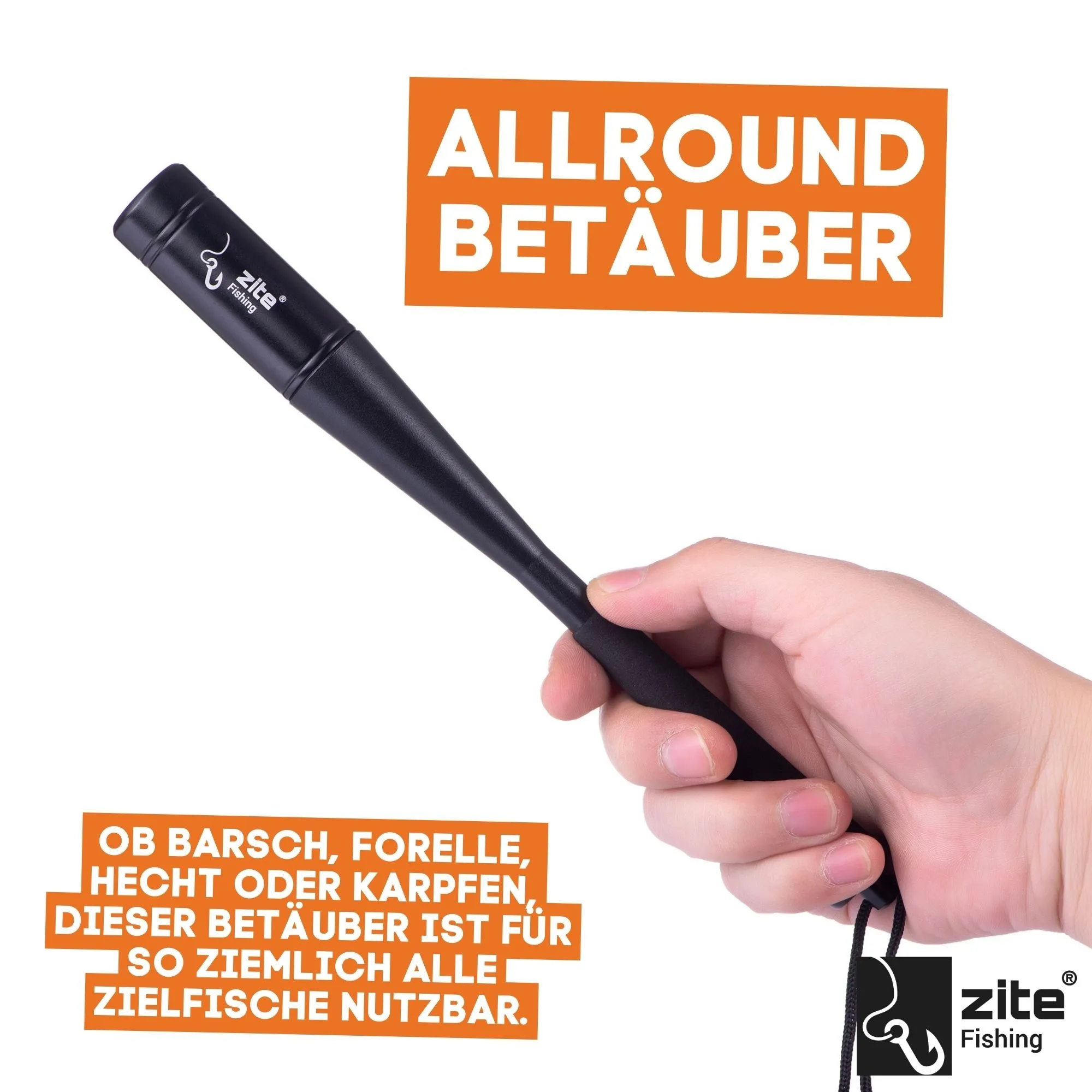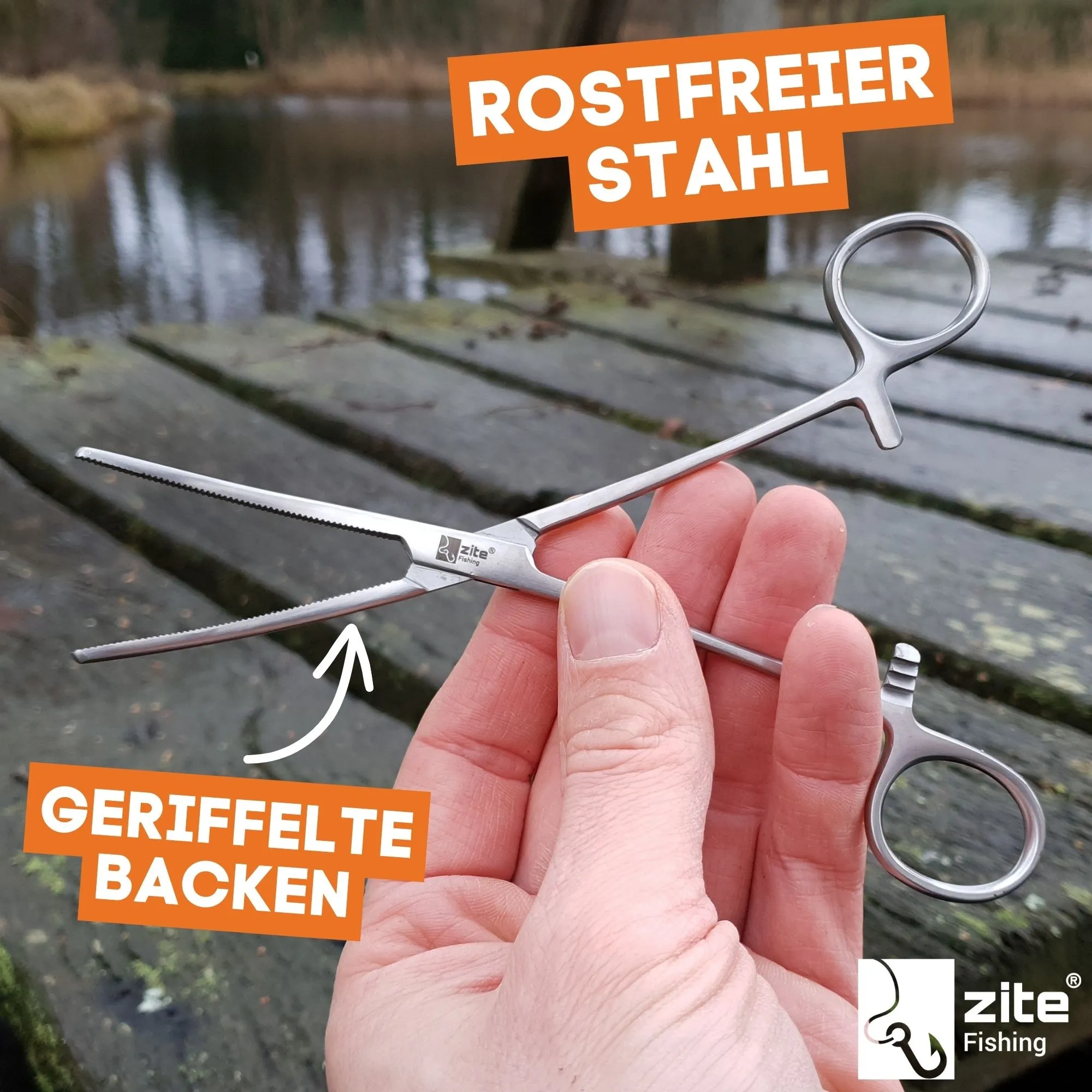 Für das Enthaken liegt eine 18 cm lange, gebogene Hakenlöser-Zange aus Stahl bei. Die gebogene Form unterstützt den Zugriff am Haken und eignet sich als kompaktes Angelwerkzeug für verschiedene Situationen. Ergänzt wird das Setup durch einen 25 cm langen Fischtöter aus Aluminium. Dank Magnet-Karabiner kann er während des Angelns am Hosenbund getragen und bei Bedarf schnell abgenommen werden.