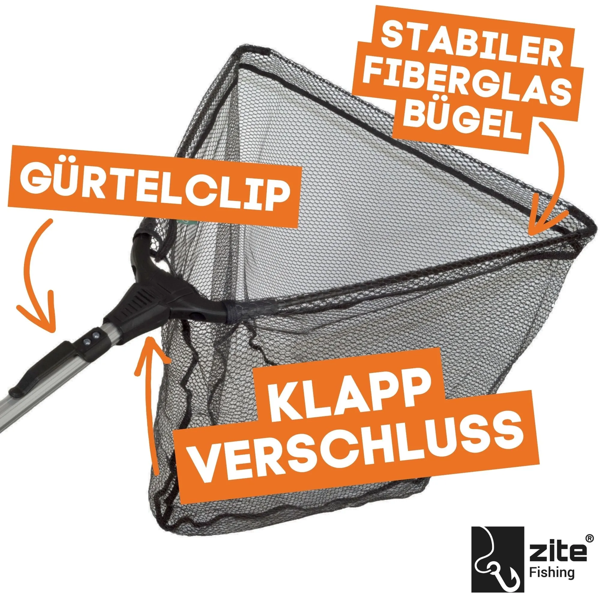 Kescher Bundle mit gummiertem Teleskopkescher 2,10 m, gebogener Hakenlöser-Zange, Aluminium-Fischtöter mit Magnet-Karabiner und Microfaser-Handtuch inklusive Karabiner.