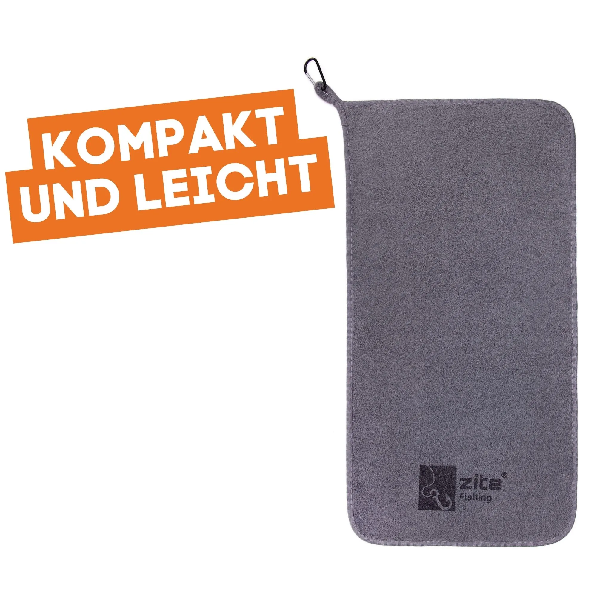 Das dezente Grau mit Zite-Fishing-Logo fügt sich unaufdringlich in vorhandenes Equipment ein. Insgesamt vereint das Handtuch hohe Saugkraft, schnelles Trocknen, kleines Packmaß, einfache Pflege und eine sichere Befestigungslösung – eine langlebige Wahl für Hände und Gerät am Wasser und auf Tour.