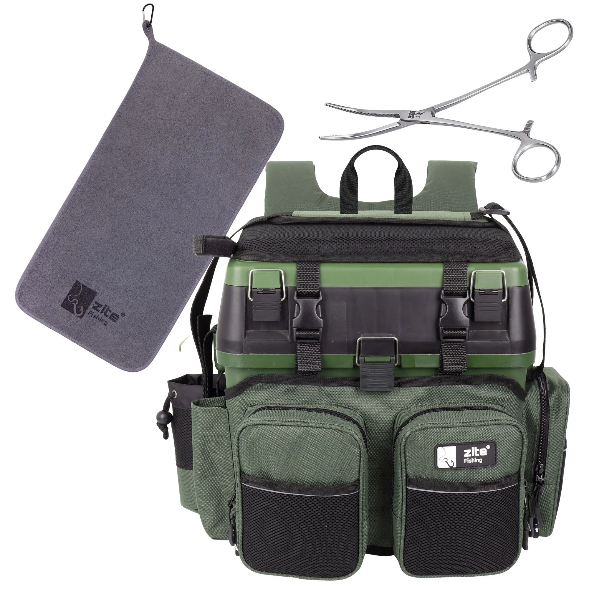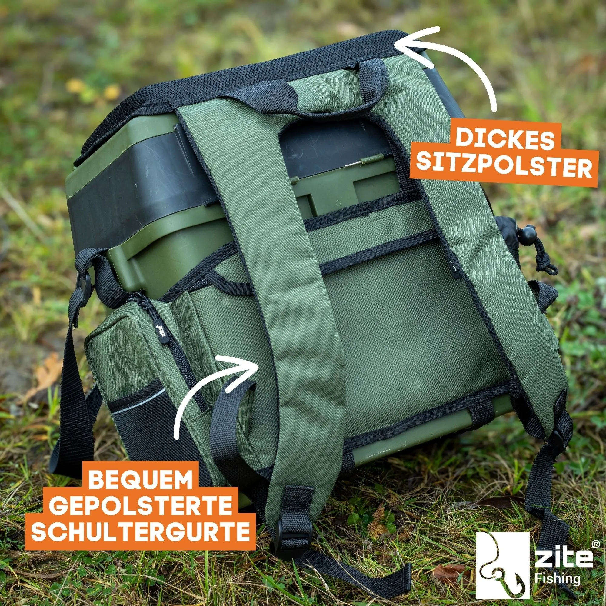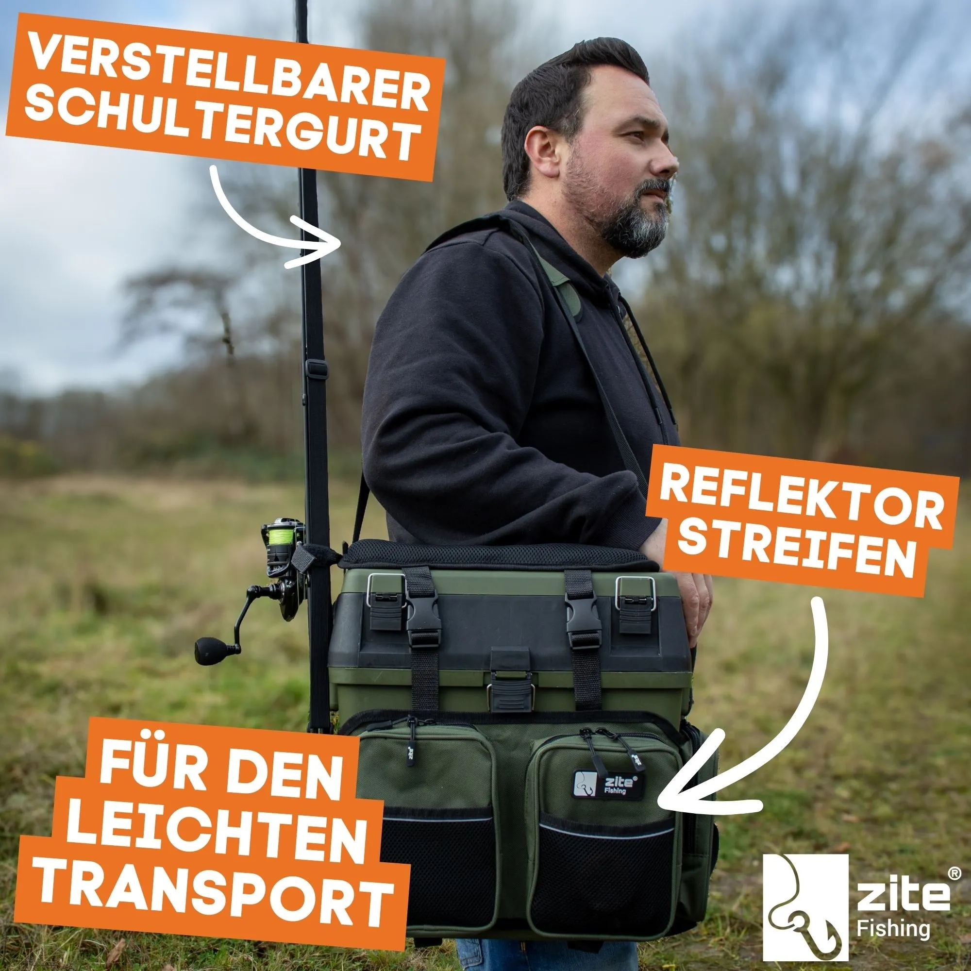Die Zite Fishing Multi-Sitzkiepe vereint Sitzmöglichkeit und Transportlösung. Durch die vielfältigen Verstaumöglichkeiten eignet sie sich gut für den schnellen Wechsel zwischen Angelplätzen. Im Deckel sind vier Kunststofffächer integriert, ergänzt durch zahlreiche Taschen sowie Rutenhalter und Flaschenhalter. Zusätzlich ist ein abnehmbarer Schultergurt vorhanden, wodurch die Tasche auch als Umhängetasche genutzt werden kann. Die Maße der Sitzkiepe liegen bei 39 × 36 × 22 cm, das Hauptfach misst 27 × 33 × 21 cm, die integrierten Kunststoffboxen im Deckel sind 3 × 14 × 7 cm groß. Das Rucksackmaterial besteht aus 100 % Polyester.