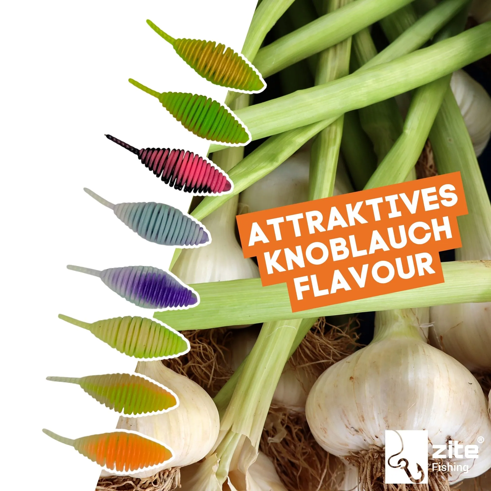 Auffälliger Schock-Mix für trübe, tiefe und dämmerige Bedingungen. 50 mm, 1,9 g, phthalatfrei. Dezent bei Slow, aggressiv bei Tempo. Knoblauch liefert eine klare Duftlinie. 8 Stück pro Dose.