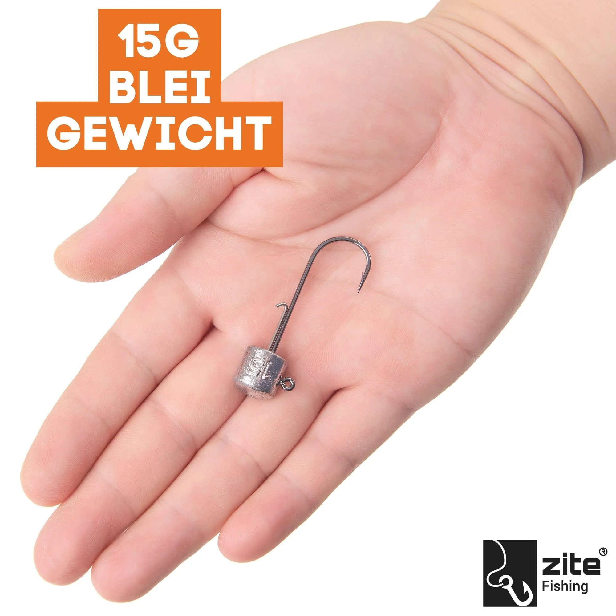Der Zite Fishing Stand-Up Jig #4/0 / 15 g steht stabil am Grund, richtet den Haken nach oben und präsentiert große Softbaits natürlich – ideal für tiefe Zonen, starke Strömung und kapitale Räuber.