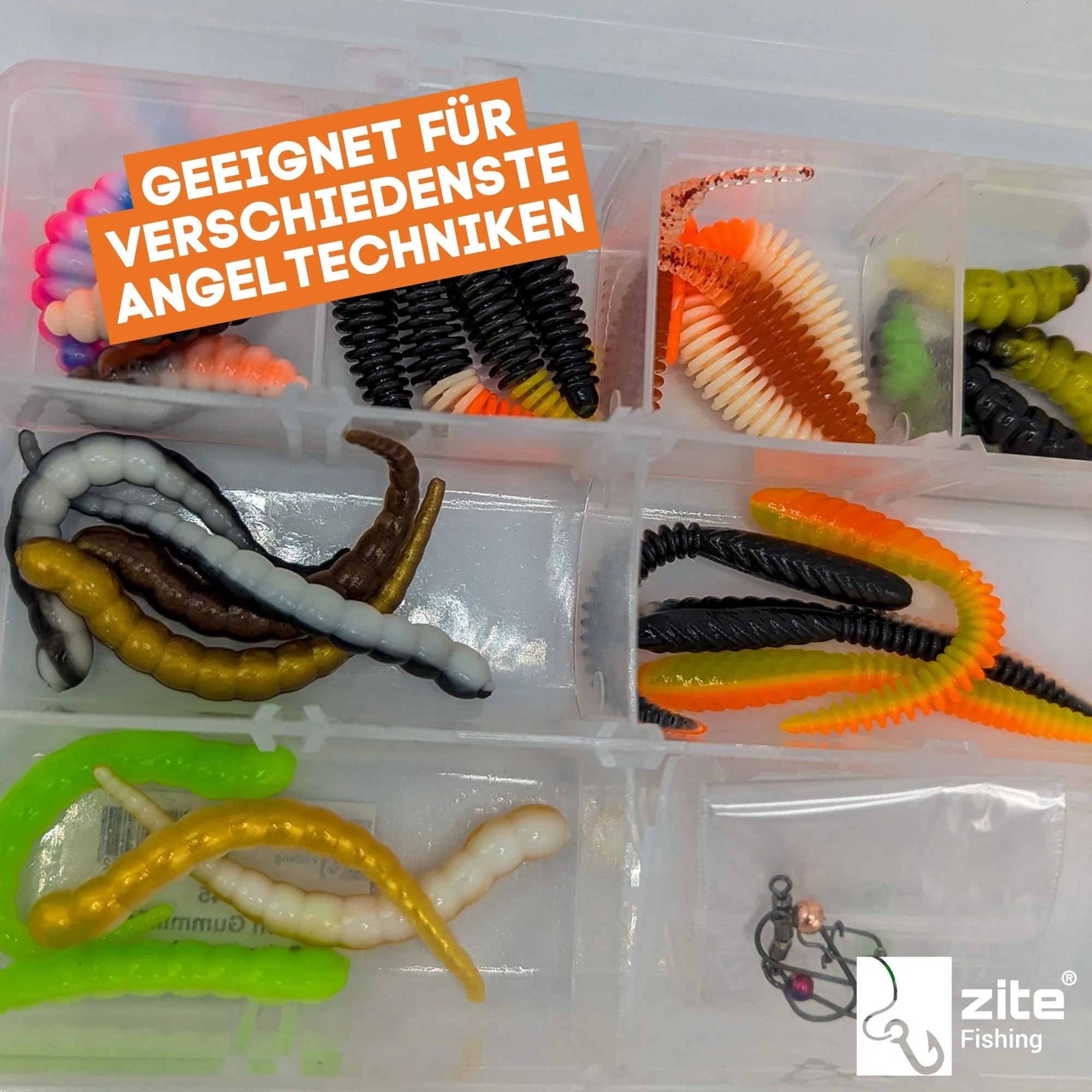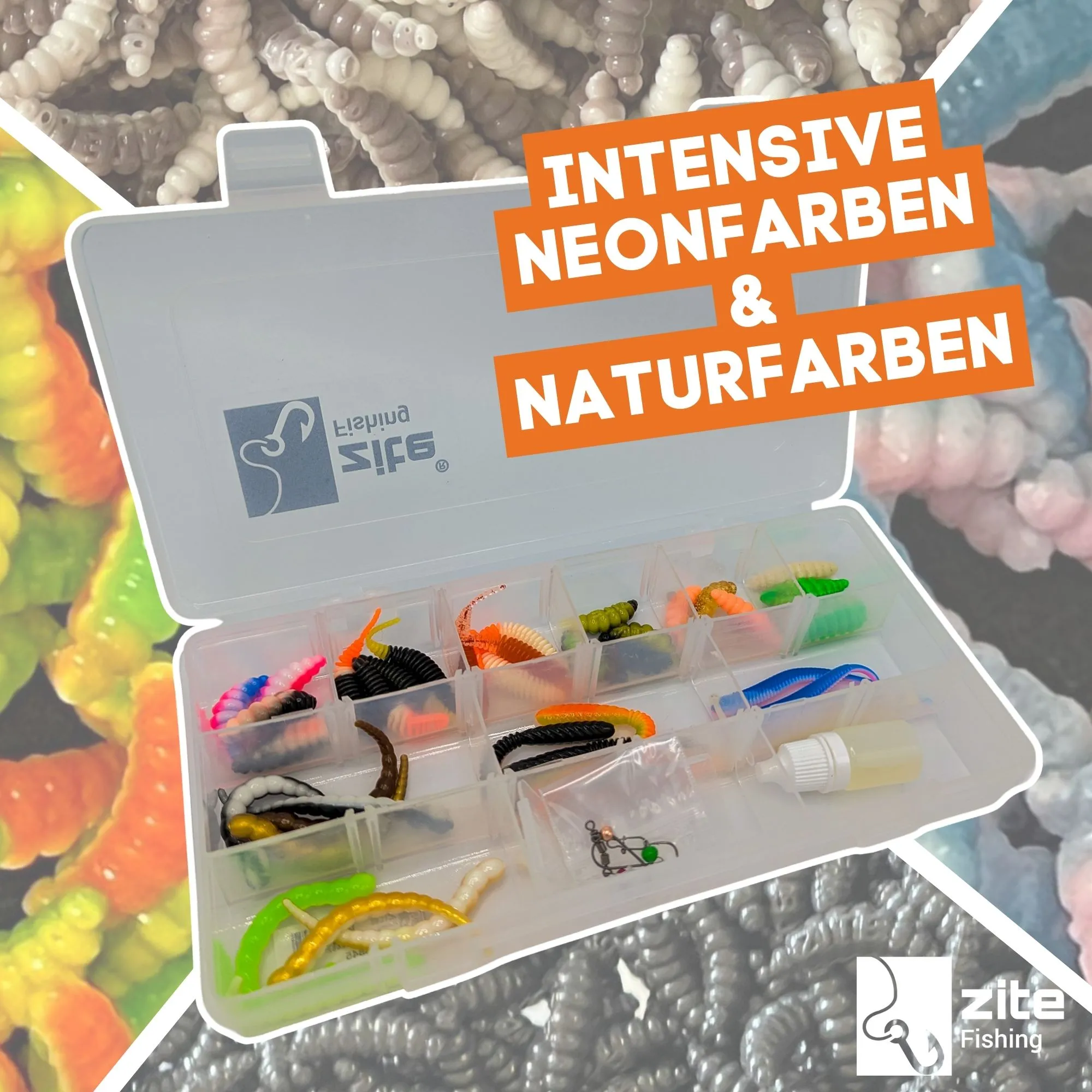 Die Zite Fishing UL Schnupperbox enthält 40 handgefertigte Gummiköder Made in Germany samt Haken und Knoblauch-Aroma – ideal für den Einstieg ins UL-Forellenangeln.