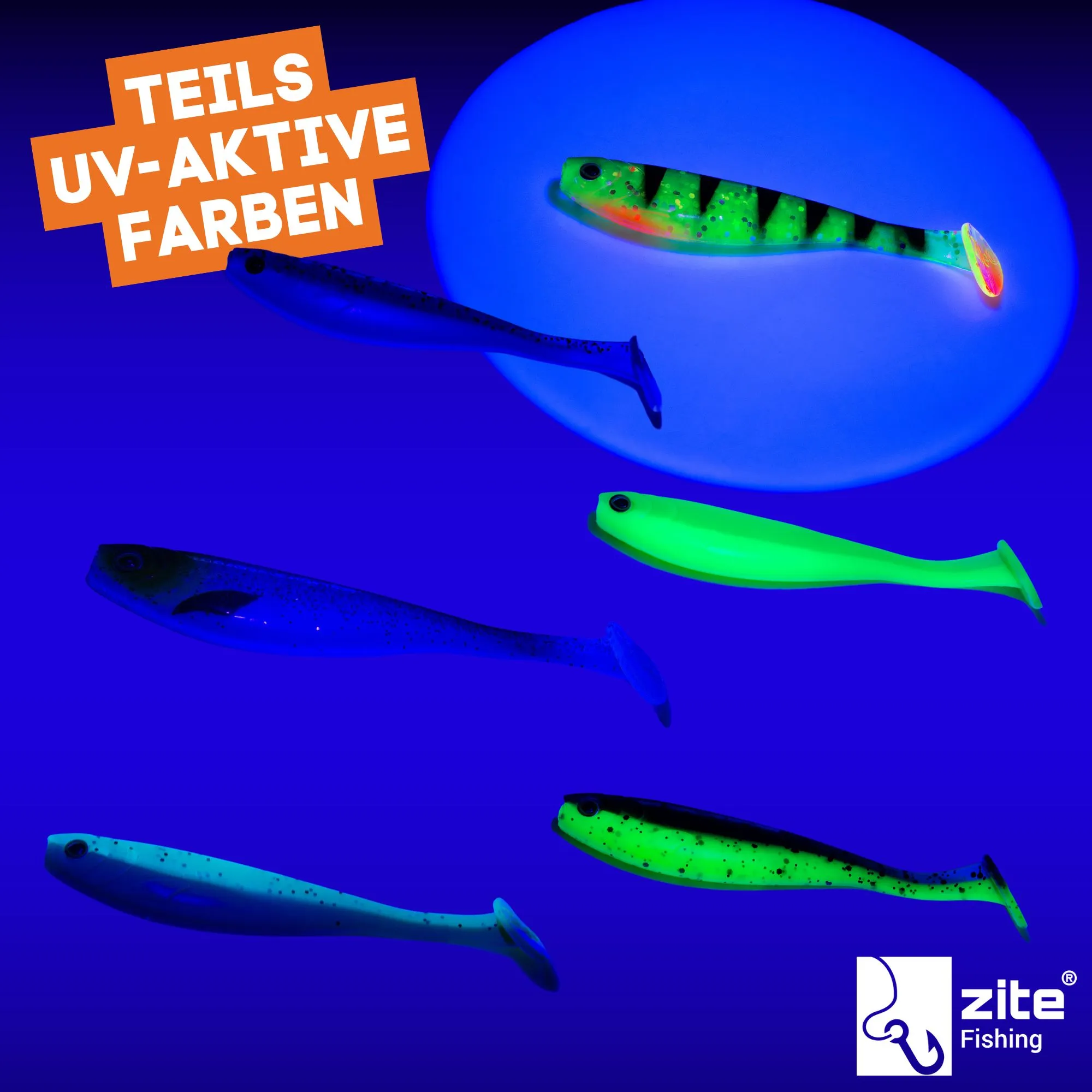 Das beigelegte Gummifisch-Set bietet mit Shads und Pershads in unterschiedlichen Farben eine durchdachte Auswahl für das gezielte Zanderangeln. Die unterschiedlichen Köderformen erlauben abwechslungsreiche Führungsstile – ob aggressiv gejiggt oder subtil präsentiert.