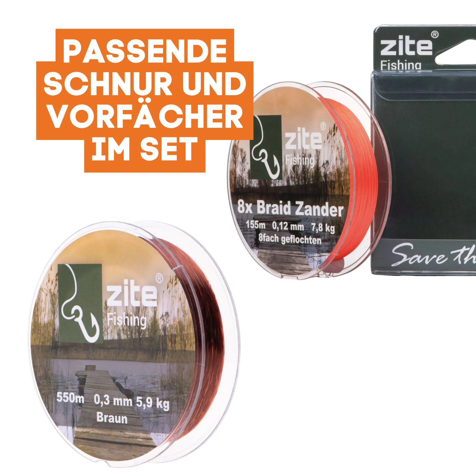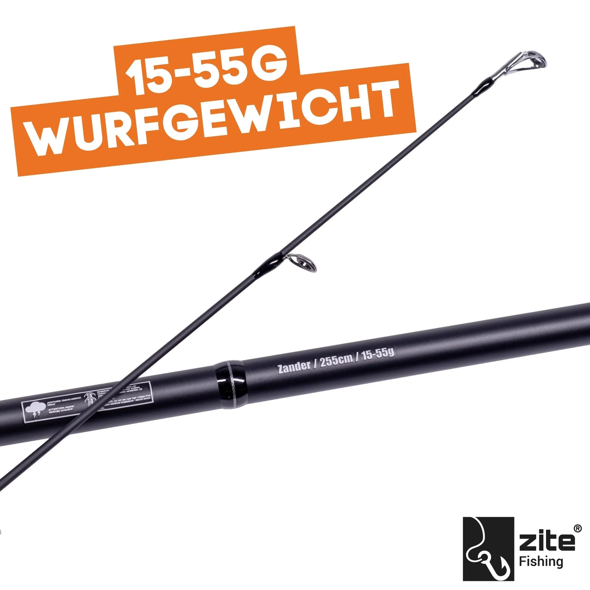 Die Inzite Base Stick Zander 255 stellt das kraftvolle Rückgrat bereit. Mit 255 cm Länge und 15–55 g Wurfgewicht lassen sich Gummifische und Jigspinner kontrolliert über Grund führen, während der reaktionsschnelle 24T-Carbonblank Bisse direkt überträgt und dennoch genug Rückgrat für saubere Anhiebe auf Distanz bietet. SIC-Ringe sorgen für ruhige Schnurläufe, der EVA-Griff liegt sicher, und die zweiteilige Steckkonstruktion reduziert das Transportmaß auf 136 cm. Mit einem Rutengewicht von 223 g bleibt das Gerät ausgewogen und ausdauerfreundlich.