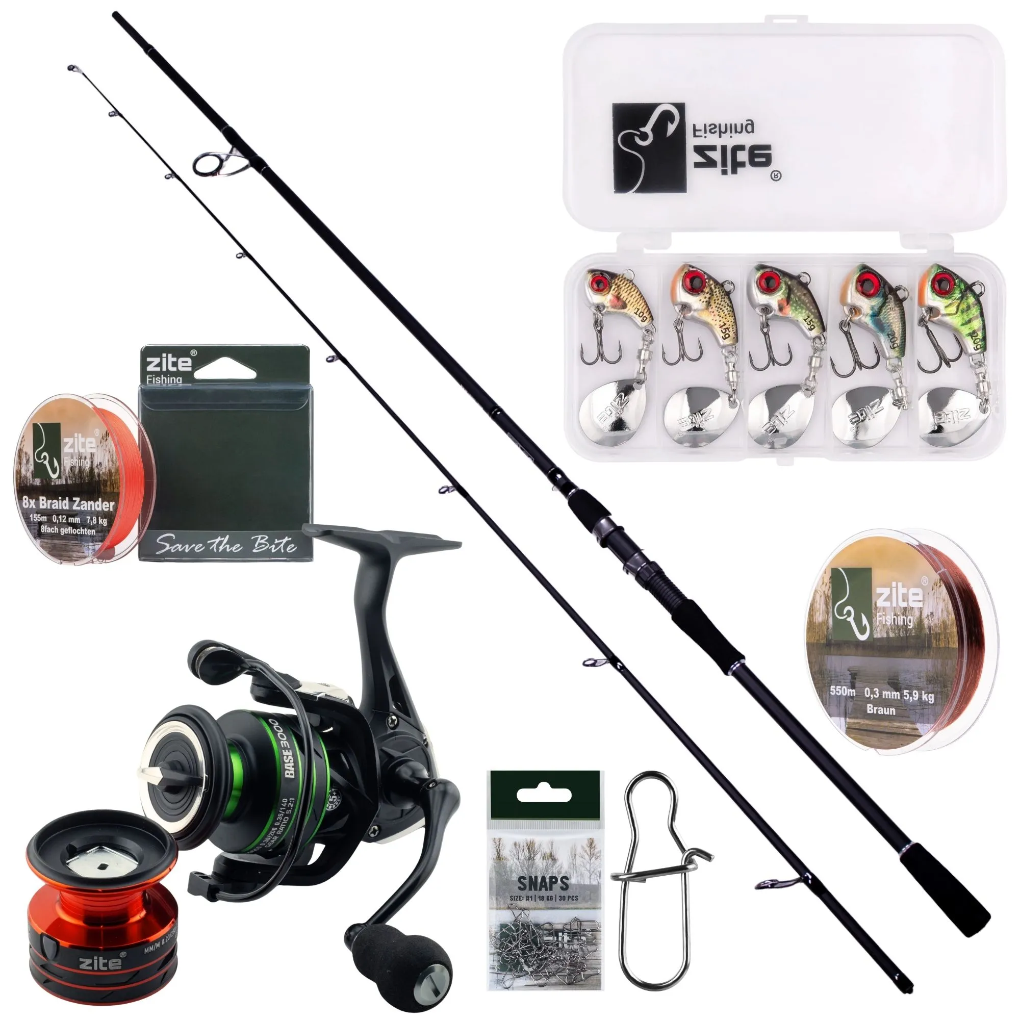 Zander-Starterset mit 2,55-m Base Stick (223 g), Base 3000 Rolle (250 g), 0,12-mm 8-Braid, 0,30-mm Mono (550 m), Snaps #1 und Jigspinnern Natur (10–20 g). Weite Würfe, klare Führung, starke Reserven.
