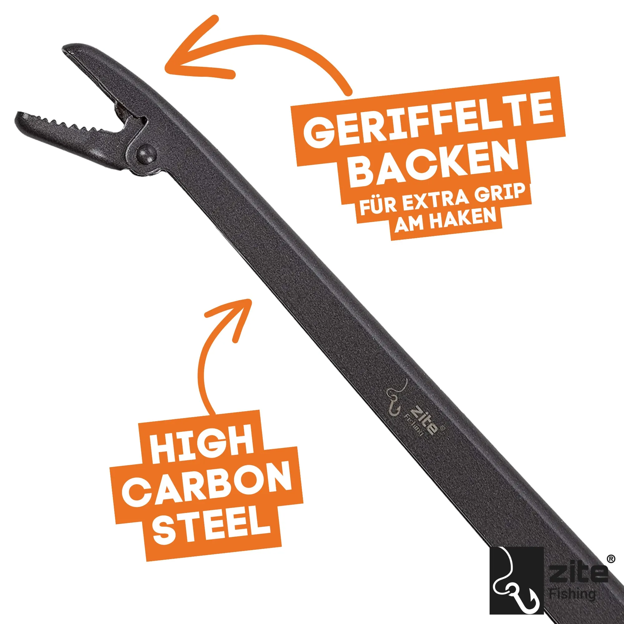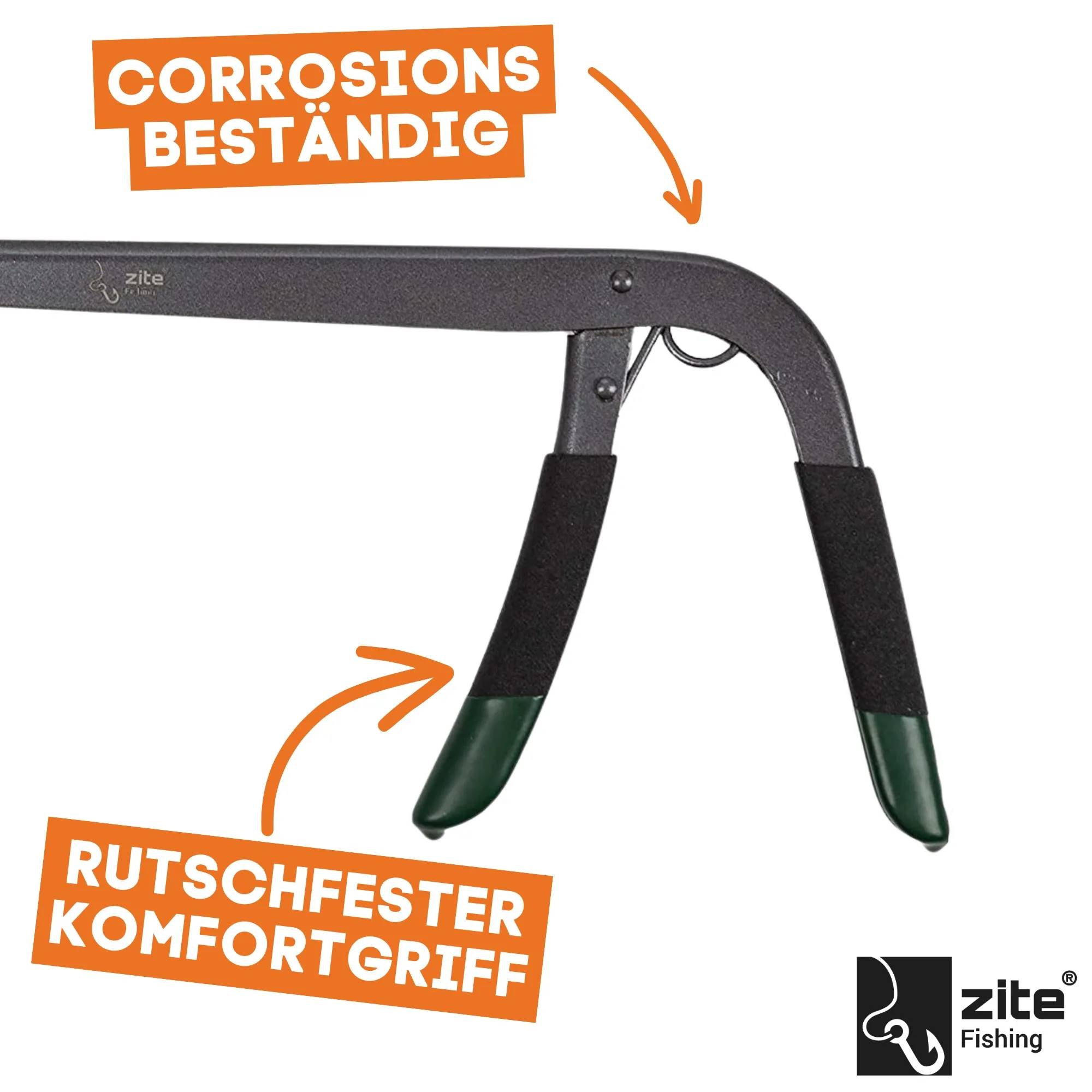 Die Zite Fishing Hakenlöser-Zange in lang macht das Lösen von Angelhaken und Drillingen aus dem Fischmaul sicher und einfach. Auch Haken die festsitzen lassen sich mit diesem Angel-Werkzeug gut entfernen. Durch die Pistolengriff-Form und einer Länge von 24,5 cm lassen sich auch tiefsitzende Haken bei Fischen wie Hecht und Wels sicher lösen, ohne mit der Hand zu weit in den Fisch greifen zu müssen. Bei der Auswahl des Materials für diese Alternative zur Arterienklemme wurde bewusst auf eine Anti-Korrosionsbeschichtung gesetzt, um ein langlebiges Angelzubehör-Tool für den Angler anzubieten.
