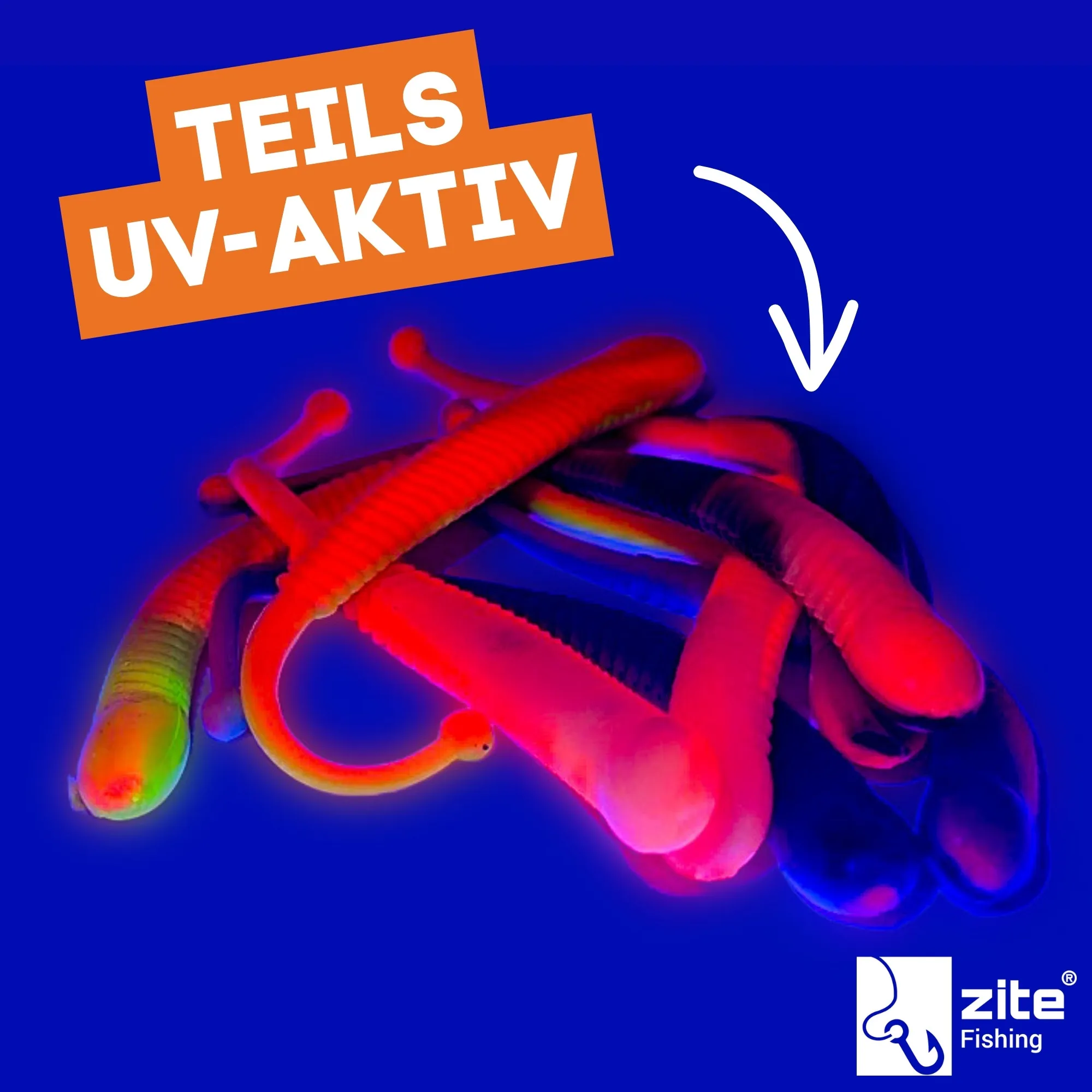 Die Zite Fishing Slinky Snake Schock Mix sind auffällige 8 cm lange Gummiköder, die durch ihre grellen, teils UV-aktiven Farben selbst in trübem Wasser oder bei schwachem Licht sofort ins Auge fallen. Die Kombination aus einer schlanken Form und einer besonders weichen Gummimischung sorgt für ein lebendiges, schlängelndes Spiel im Wasser. Die nach vorne verlagerten Rippen leiten den Wasserdruck gezielt weiter und bringen den Köder schon bei minimaler Bewegung in Aktion.