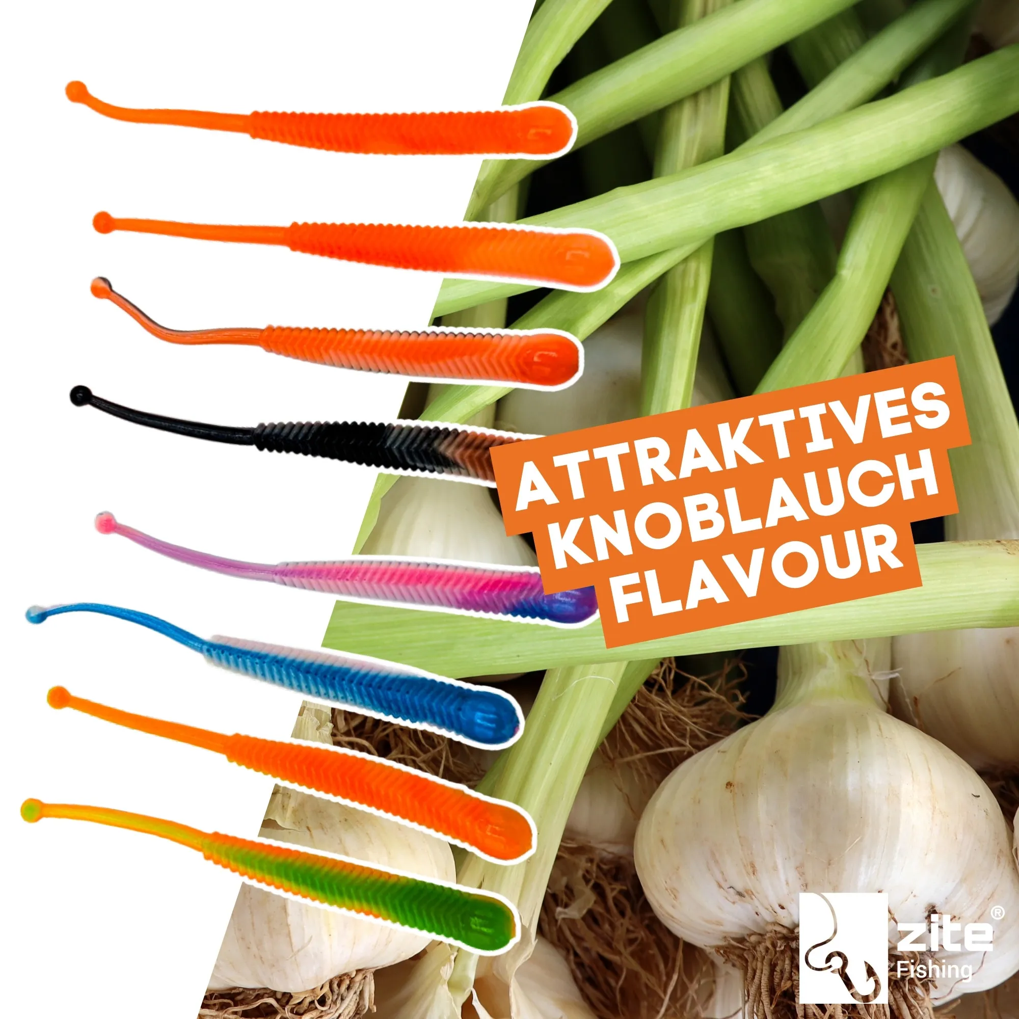 Die Fertigung erfolgt in Deutschland in präziser Handarbeit aus phthalatfreier Gummimischung, frei von schädlichen Weichmachern und zugleich fischschonend. Ergänzt wird das optische Reizspektrum durch die Aromavarianten Knoblauch und Käse, die seit Jahren für ihre hohe Fangquote bekannt sind.