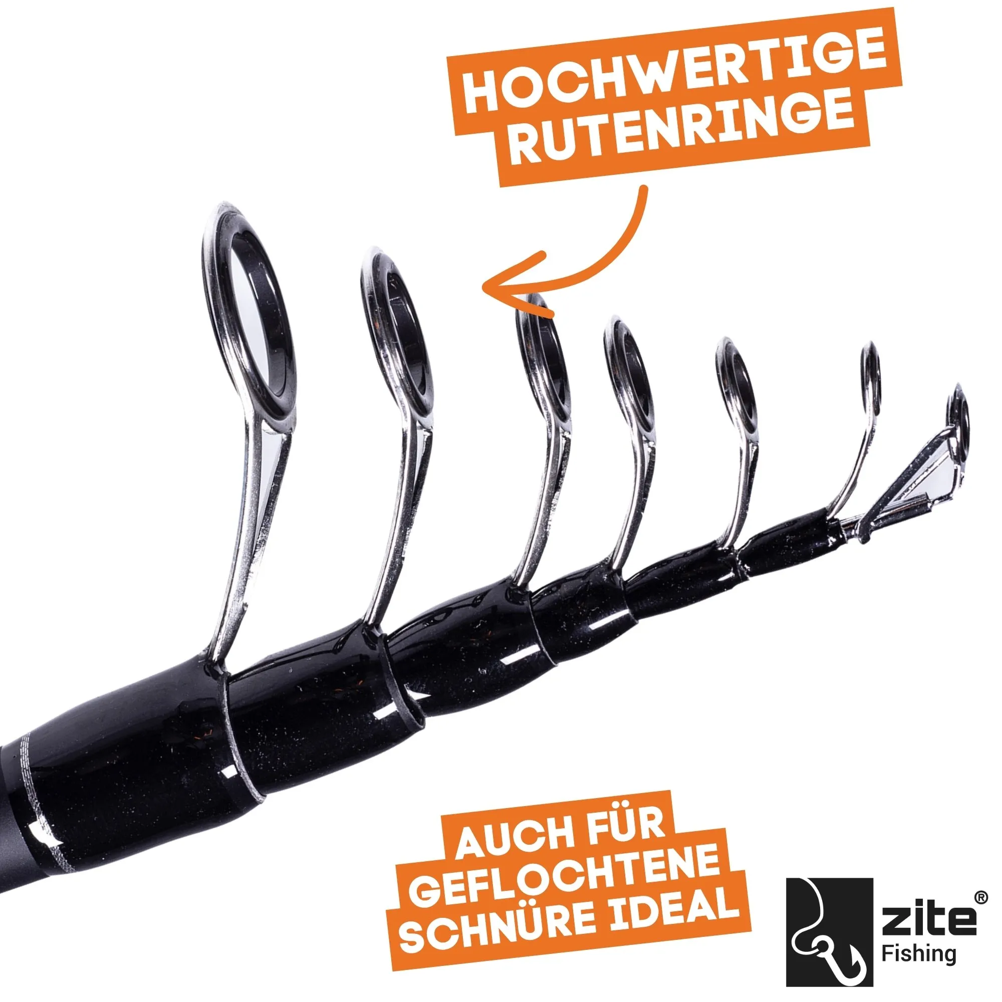 Durch die teleskopische Konstruktion erreicht die Rute eine kompakte Transportlänge von 102 cm bei einem Gewicht von nur 184 g. Ein Kunststoff-Rutenschutz schirmt Spitzenbereich und Ringe vor Stößen und Druck ab. Ergänzend wird die Rute in einem einfachen Stofffutteral geliefert, das Transport und Aufbewahrung erleichtert und sie vor Staub sowie Kontakt mit anderer Ausrüstung schützt.