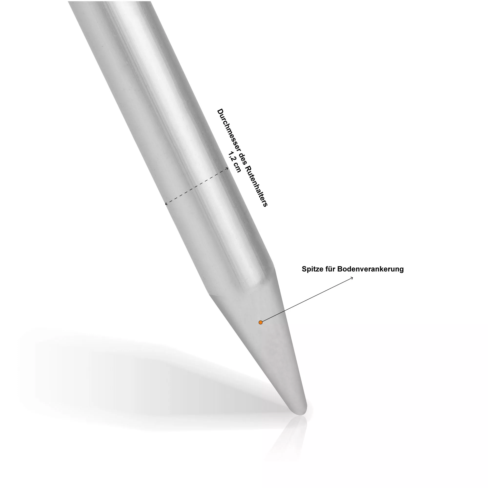 Der Rutenhalter besteht aus robustem Aluminium. Durch den spitzen Erdspieß lässt er sich einfach in den Boden stecken.
