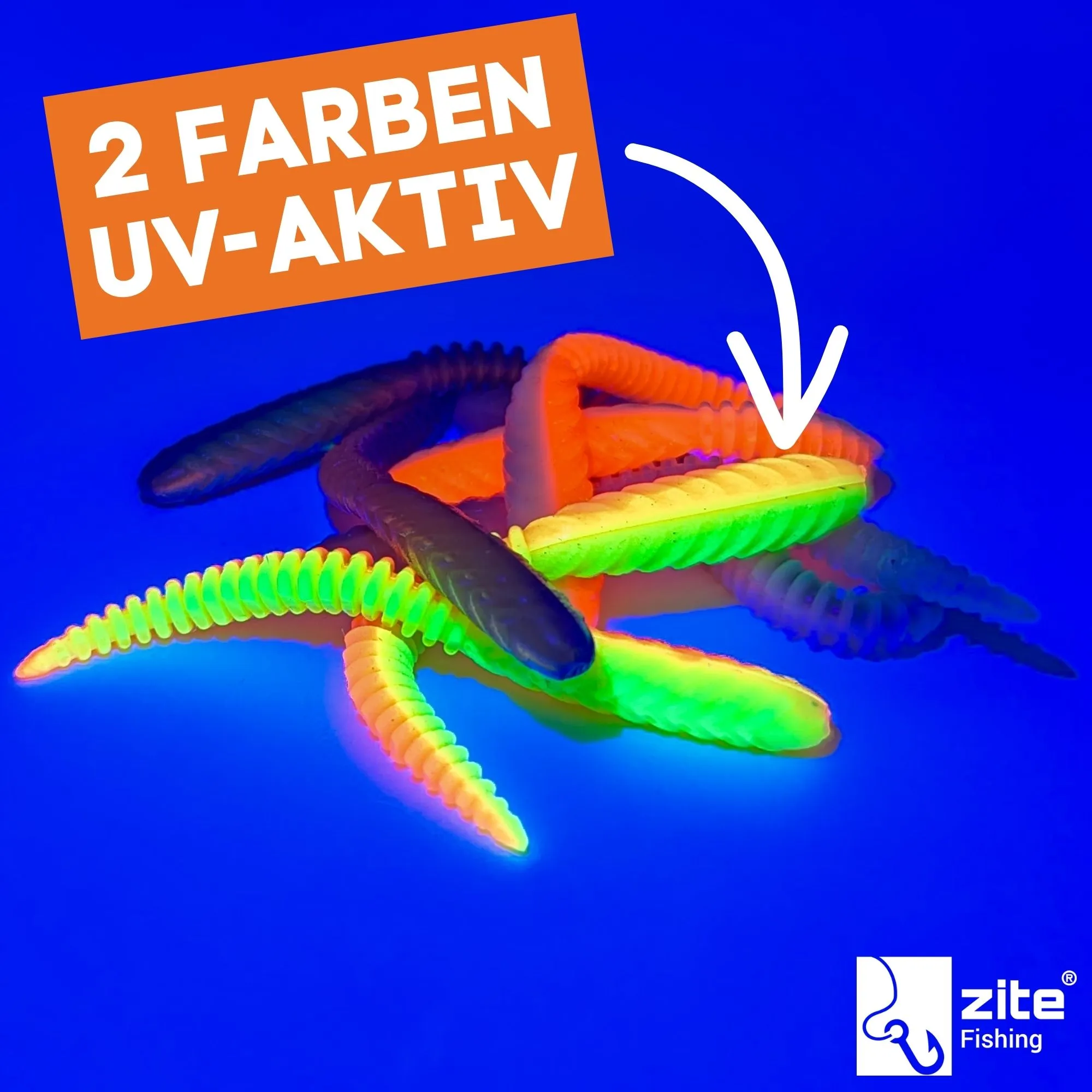 Twerky Tailer Shiny Mix mit Käse-Aroma – UV-aktiver, handgefertigter 3in1-Gummiköder für Forellen. Vielseitig, auffällig und fängig – ideal bei trübem Wasser und schwierigen Bedingungen.