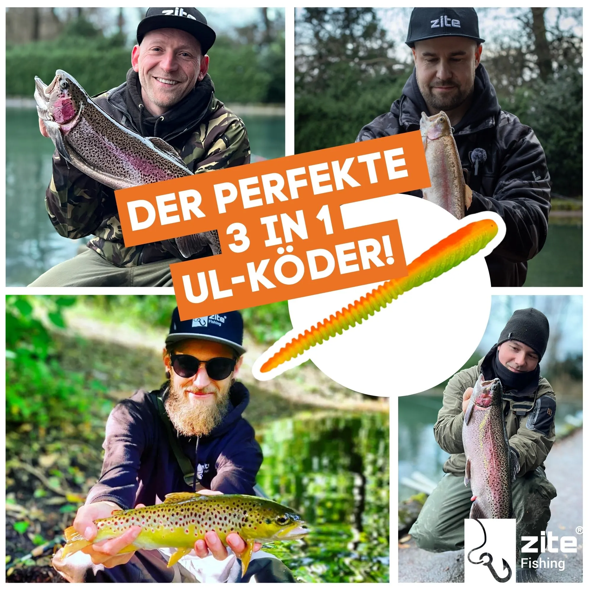 Der Köder besteht aus einem festen Vorderteil und einem hochflexiblen Rippenschwanz – beide Teile lassen sich getrennt oder als kompletter Köder fischen. Ideal für Ultra Light, Standruten-Montagen oder aktive Techniken am Forellensee.