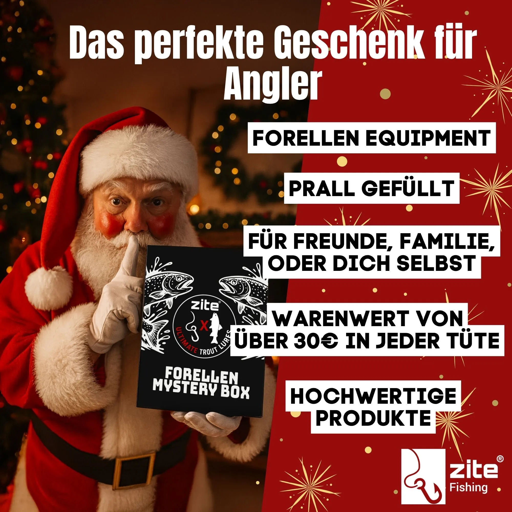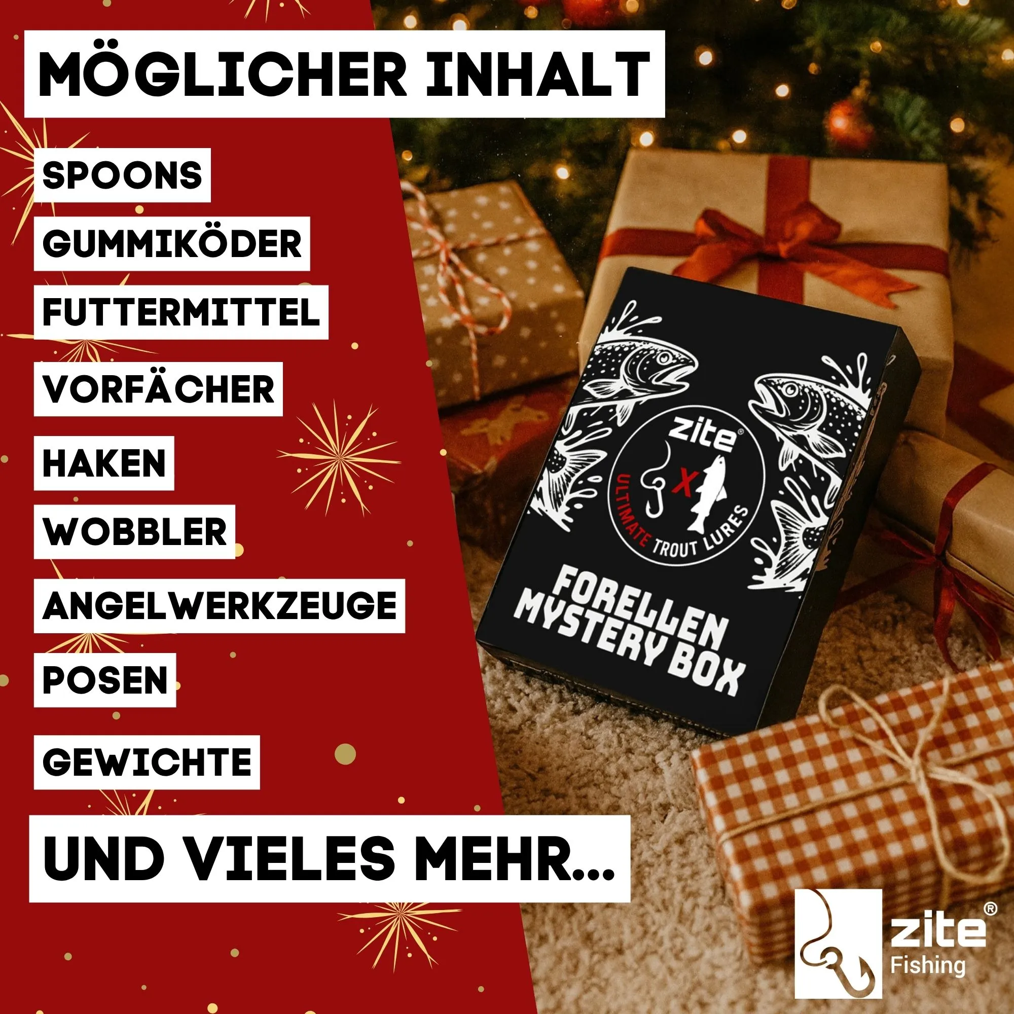 Die Forellen Mystery Box ist das ideale Weihnachtsgeschenk für jeden Forellenangler. Entwickelt von Zite Fishing und Ultimate Trout Lures, bietet sie einen Warenwert von über 30 € zum Preis von nur 19,98 € – ein echtes Schnäppchen für Einsteiger und Profis.