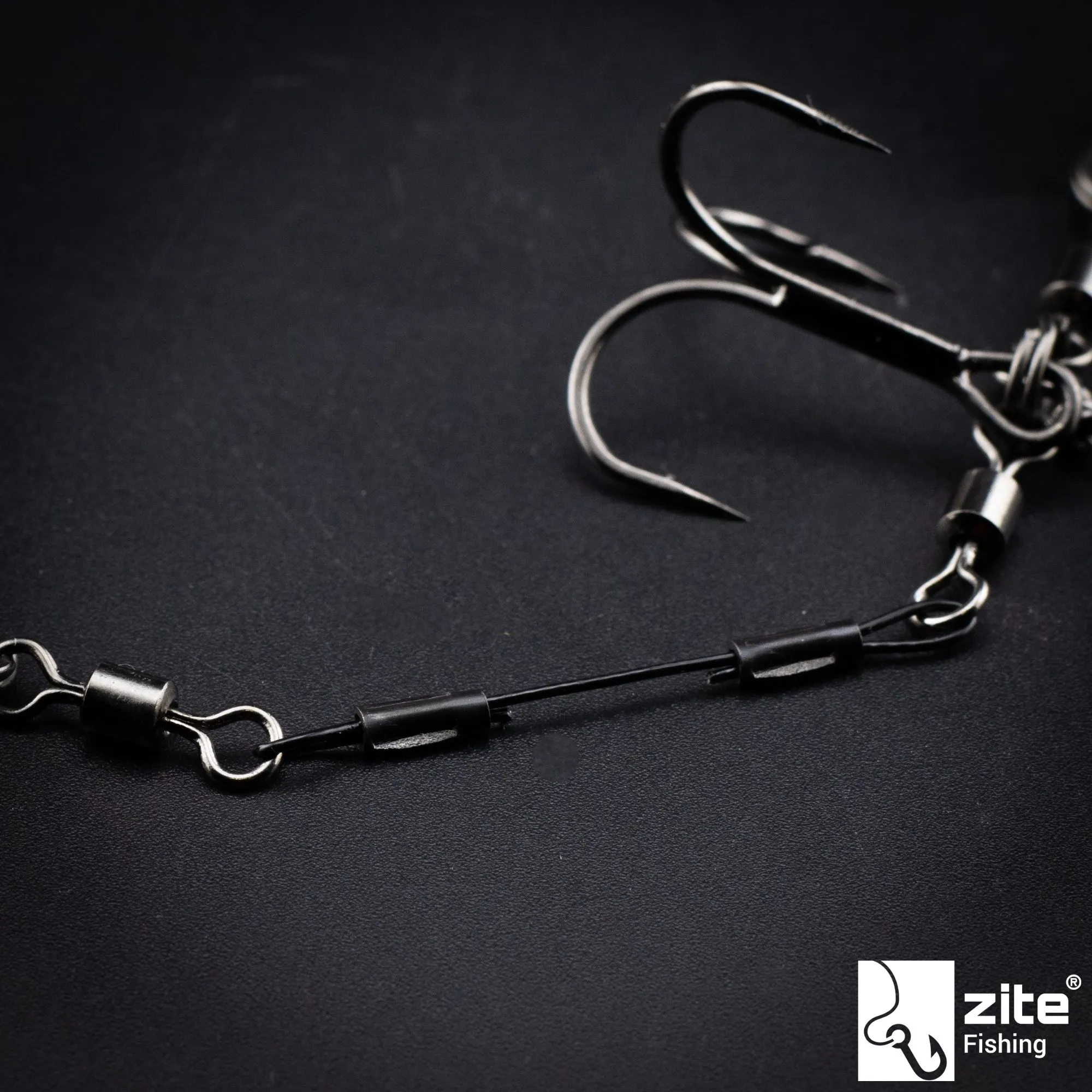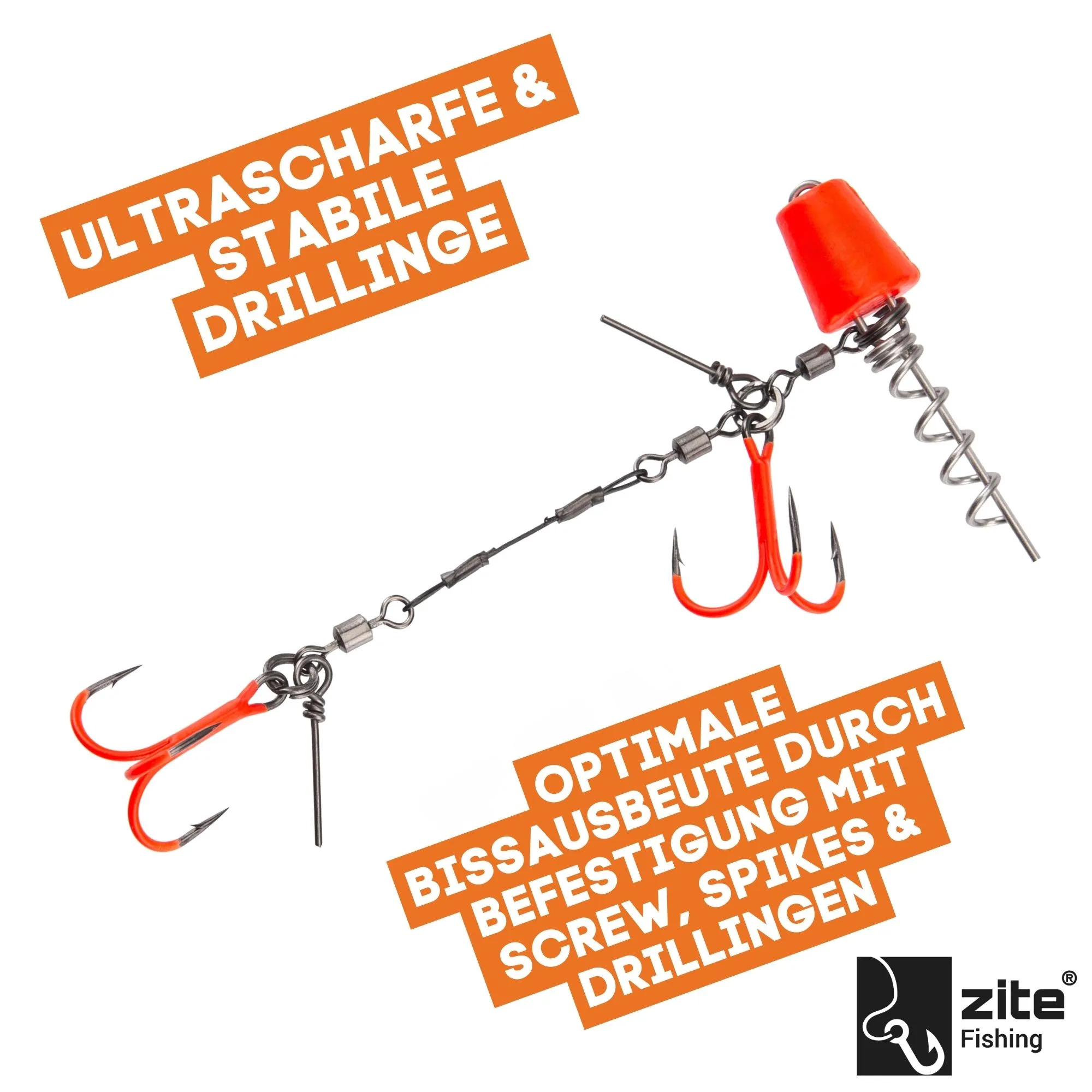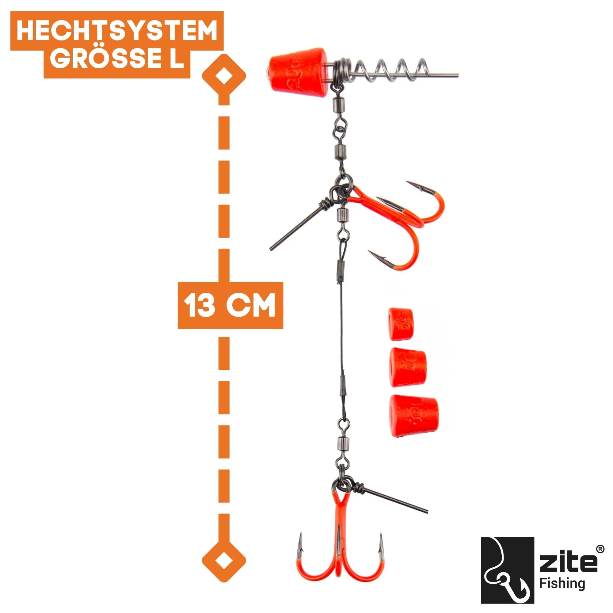 Das variable Hechtsystem in Größe L – UV Neon – misst 13 cm und ist auf großformatige Softbaits von 21–26 cm ausgelegt. Eine schraubbare Aufnahme richtet den Köder mittig aus, das belastbare Stahlvorfach trägt eine passend abgestimmte Stinger-Montage. Kohlenstoffstahl-Drillinge sorgen für zuverlässige Hakeigenschaften, auch wenn kapitale Räuber nur kurz zupacken. Die UV-aktive Neonfärbung erhöht Kontrast und Sichtbarkeit, wodurch der Köder in Trübung, Dämmerung oder größerer Tiefe schneller wahrgenommen wird.