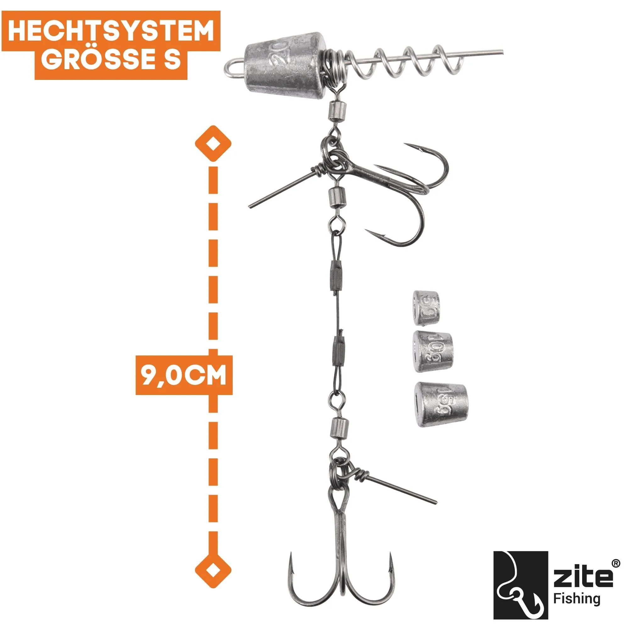 Variables Hechtsystem S, 9 cm, Natur. Für 15–20 cm Gummifische. Screw, Stahlvorfach, Kohlenstoffstahl-Drillinge. Vier Bleigewichte (5/10/15/20 g) für schnelle Tiefen- und Aktionskontrolle ohne Köderdemontage.