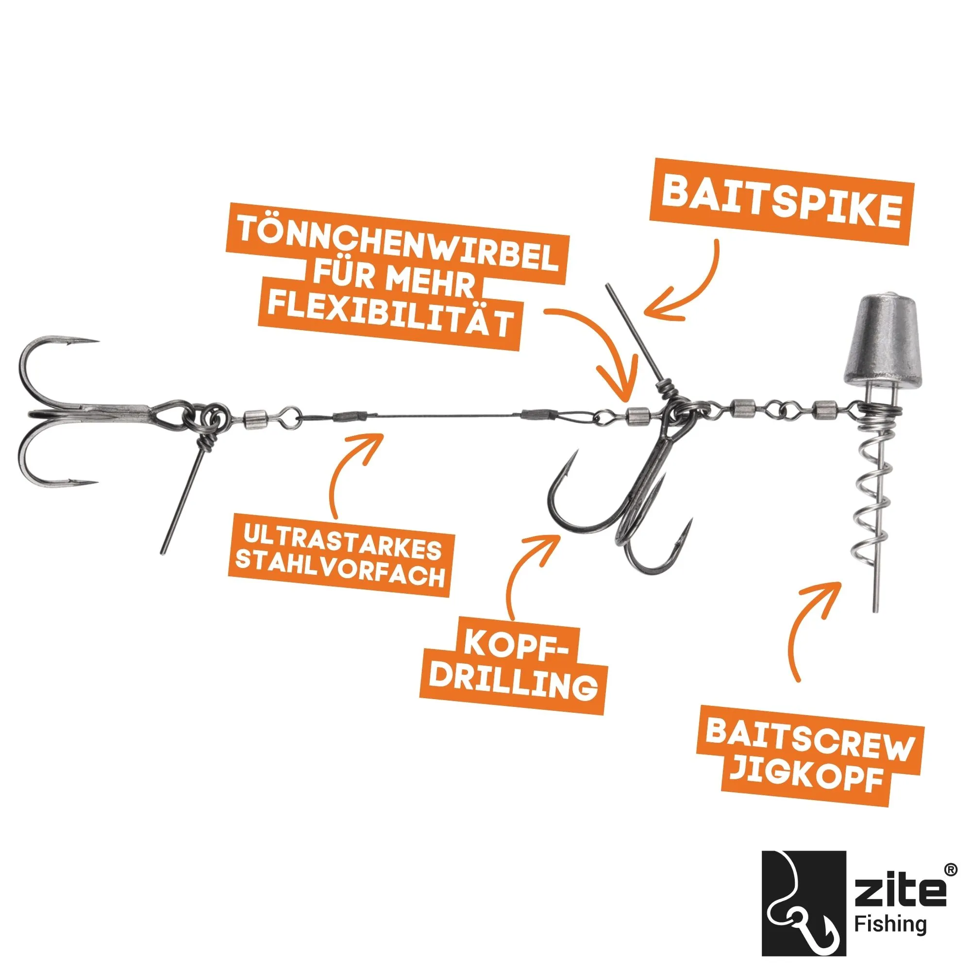 Als praxistaugliche Alternative zum Jigkopf sorgt die Screw für saubere Ausrichtung, die Stinger-Position erhöht die Bissverwertung, und die natürliche Farbgebung vermeidet Überreizung. Geliefert wird ein einsatzbereites Hechtsystem Größe S (9 cm) in Natur mit schraubbarer Kopfsektion, robustem Stahlvorfach, Stinger-Drillingen aus Kohlenstoffstahl sowie vier schnell wechselbaren Bleigewichten (5/10/15/20 g).
